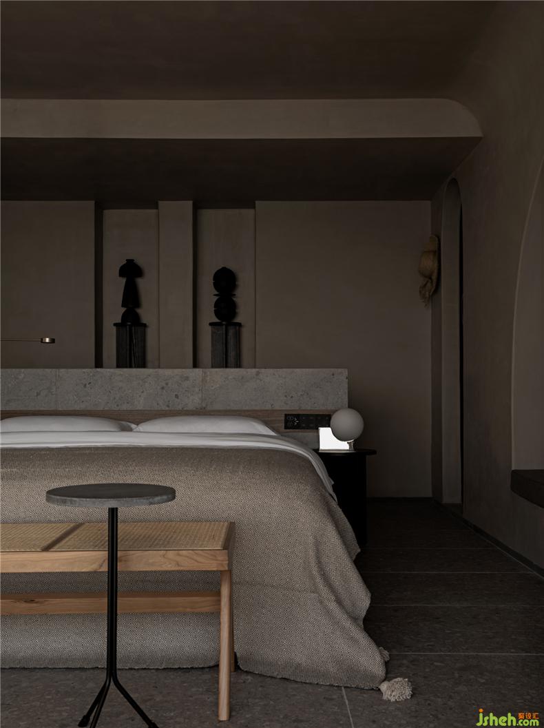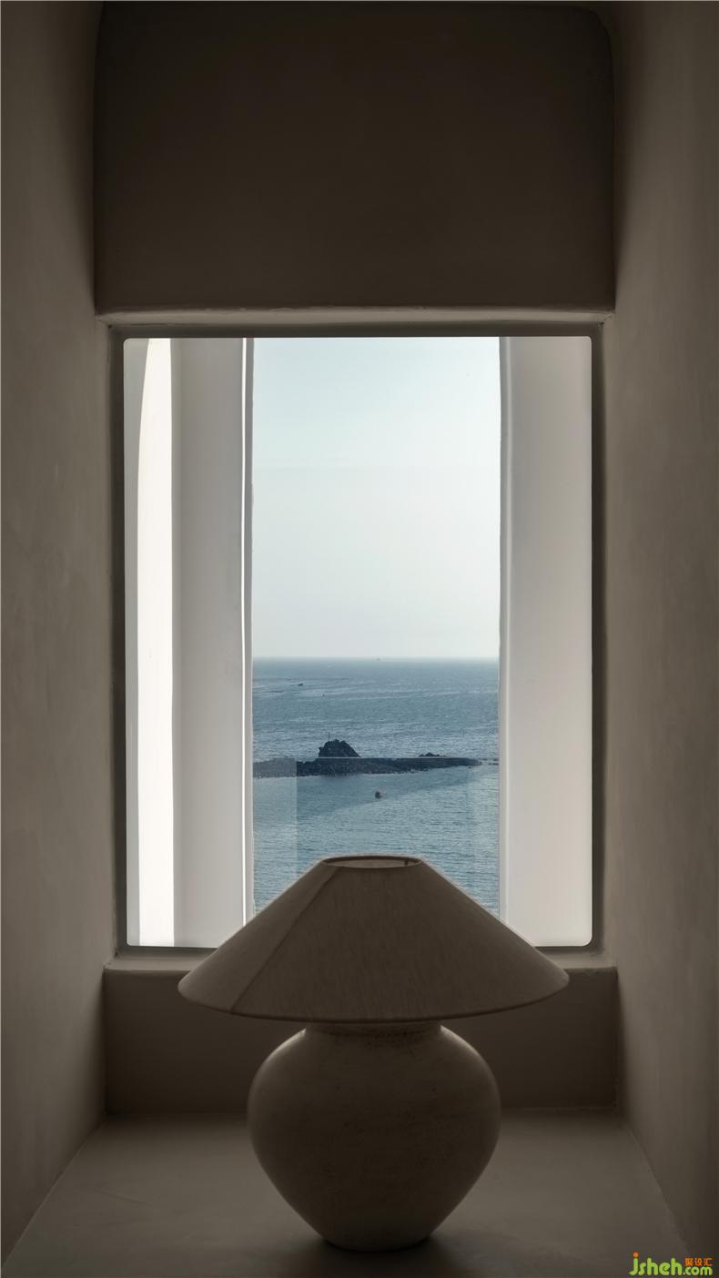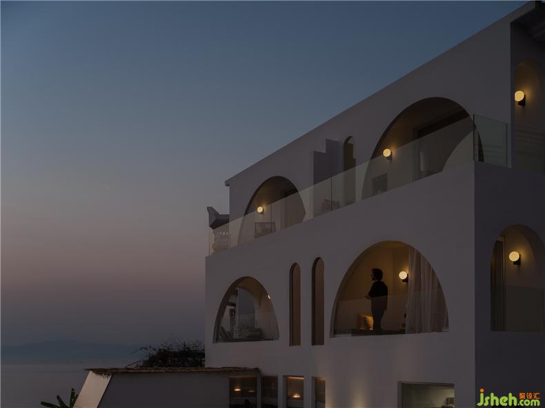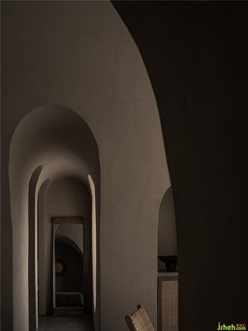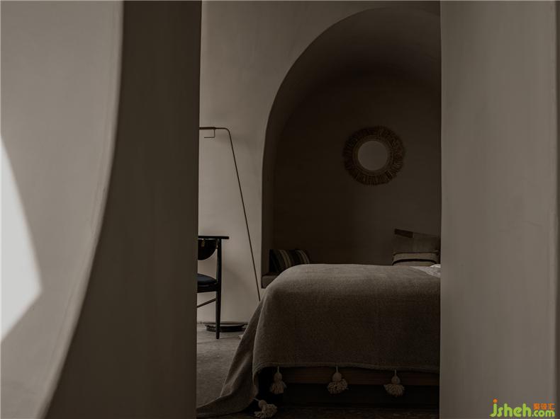 入門即是風(fēng)景,大概是客人們對房間的最高評價了。設(shè)計師將玻璃窗大面積的置入室內(nèi),將自然闊景與光影詩意引入其中,形成建筑內(nèi)外的互動對話。側(cè)目滿眼碧海,抬頭皆是星光,為整個房間增添了無窮盡的浪漫主義色彩。弧形的圓拱設(shè)計,營造出洞穴般的原始風(fēng)情,同素凈的墻壁一起,展現(xiàn)出一種質(zhì)樸的粗糲感。光影如海浪般在屋內(nèi)起伏,勾勒著建筑的邊界與線條。民宿設(shè)計在強化了弧的張力的同時,延伸著曲面帶來的視覺廣度。