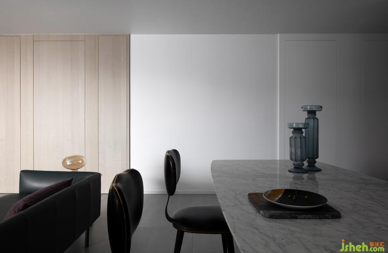 沙發(fā)背后的空間讓渡給了用餐區(qū),一張長(zhǎng)長(zhǎng)的大理石方桌,室內(nèi)設(shè)計(jì)師便足以承載一場(chǎng)大型的家庭聚會(huì)。餐桌上的陶瓷擺件,成為了素雅空間里的一抹亮色,為屋主的日常生活帶來了雅致的情趣。