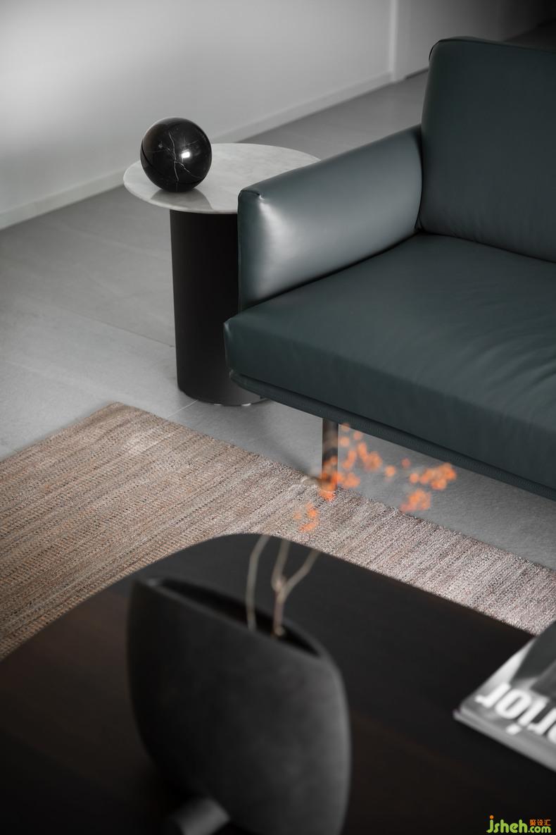 客廳是空間風(fēng)格展示的第一站,也是整個(gè)家庭裝修風(fēng)格的定調(diào)。室內(nèi)設(shè)計(jì)師為保留空間的簡(jiǎn)單優(yōu)雅,客廳并沒有放置過多的裝飾,銅銹綠的皮質(zhì)沙發(fā)安放于整個(gè)空間的正中線,與茶幾上的紅梅花藝相互呼應(yīng),在共作一副極具意境的紅梅映雪圖之時(shí),將客廳空間一分為二。