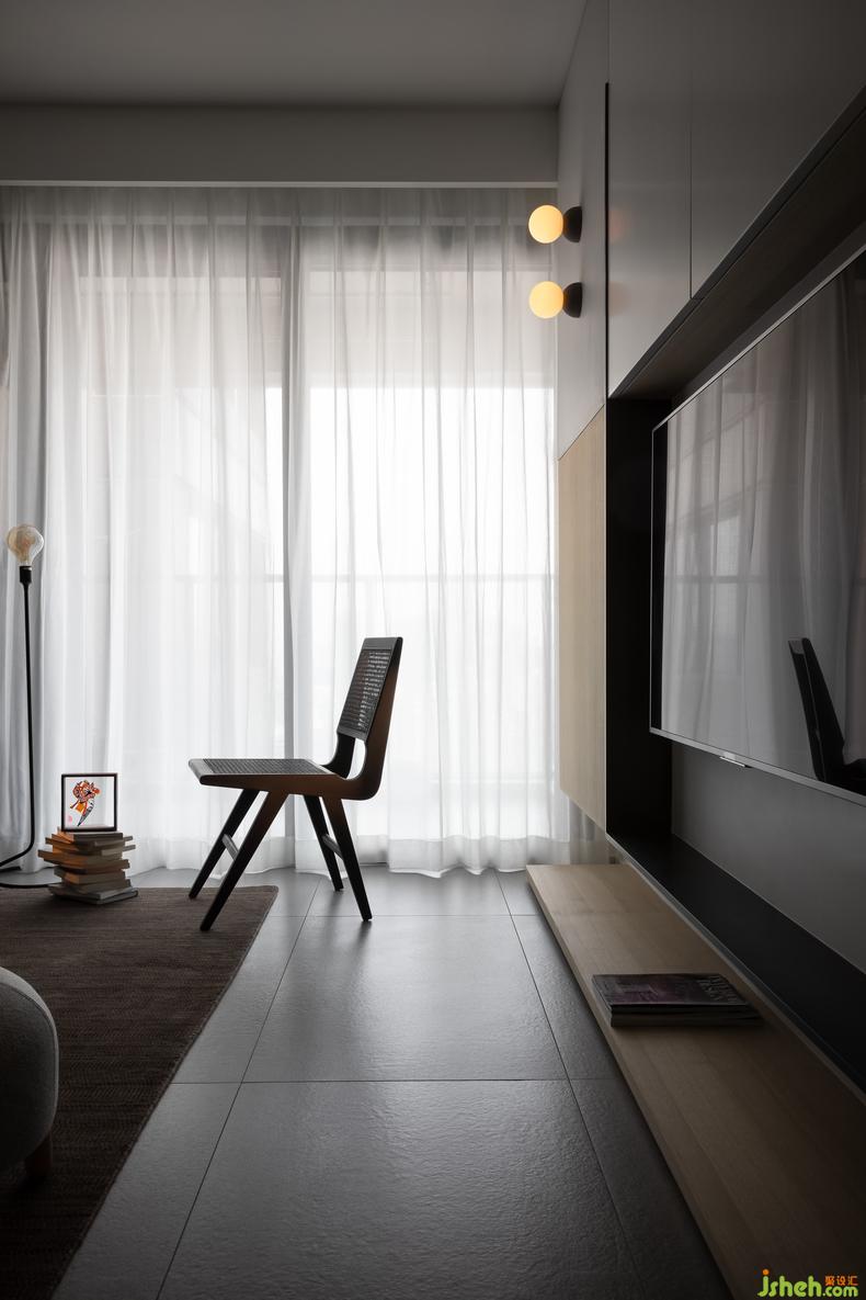 將視線從沙發(fā)后向前方流動(dòng),場(chǎng)景的功能模式便在人的動(dòng)線行進(jìn)中,室內(nèi)設(shè)計(jì)師實(shí)現(xiàn)了自由切換——“一半熱情相處,一半溫柔陪伴”。沙發(fā)正前方的位置,保留了原始的休閑功能。坐于沙發(fā)之上,將陽(yáng)臺(tái)門(mén)打開(kāi),徐徐吹來(lái)的晚風(fēng),帶來(lái)閃閃星光的囈語(yǔ),一整日的疲憊緊張,就這樣被清爽抹去。