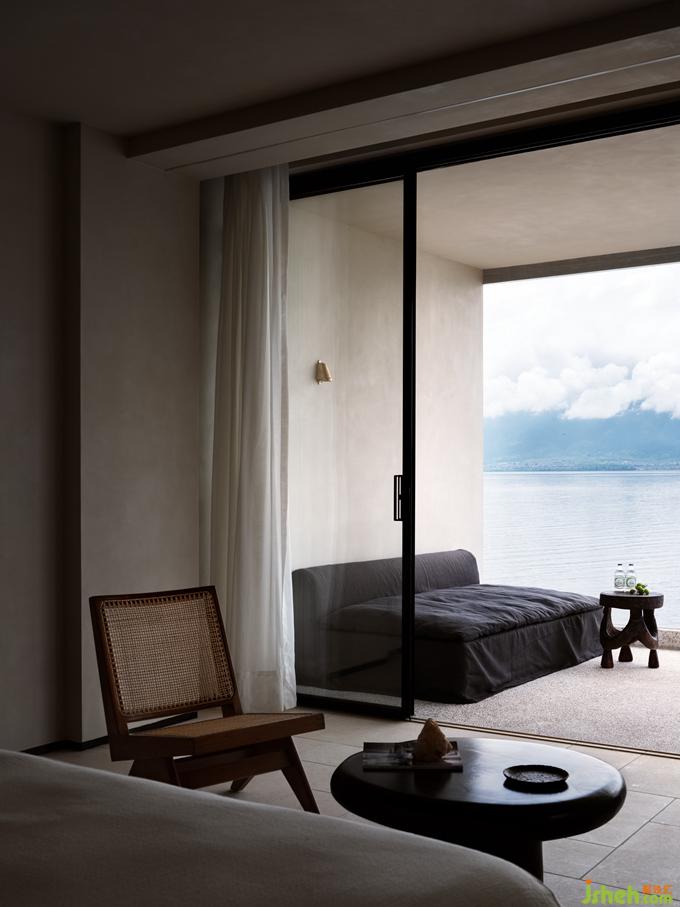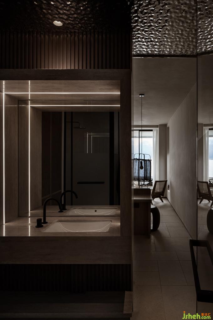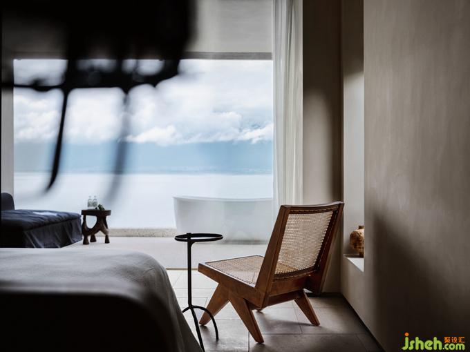 房間是人的最休閑之處,在使用當(dāng)中更應(yīng)當(dāng)以人的使用體驗(yàn)為衡量標(biāo)準(zhǔn)。蜚聲在天花板處巧妙安置了一塊浪漫的水波紋,與窗外的洱海相互呼應(yīng)。在點(diǎn)點(diǎn)閃動(dòng)的光影浮沉與流動(dòng)間,提升了空間質(zhì)感,增加了居住者的趣味性。