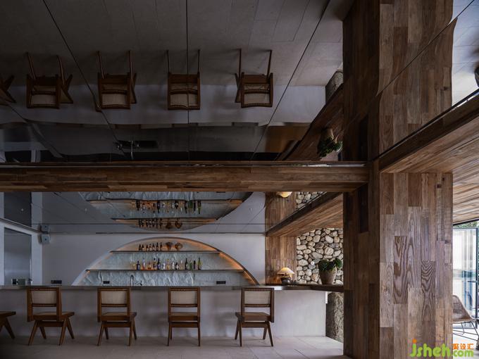 木體是建筑的骨架,將整棟樓支撐起來,撐開視野廣度與明暗空間。用石頭搭建出一整面墻,原始風(fēng)情與野奢趣味就此匹配。