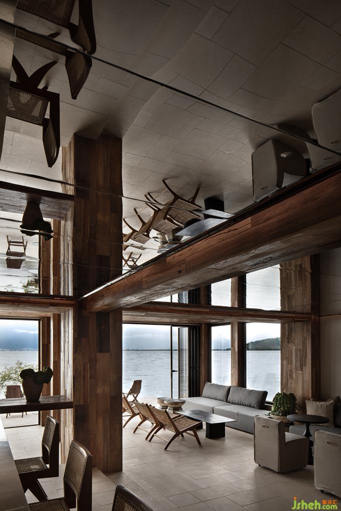 頭頂?shù)溺R面大概是最為現(xiàn)代的材料,通過光影明暗折射出更寬廣的視覺效果,在完成室內(nèi)外的景致投射的同時(shí),民宿設(shè)計(jì)構(gòu)建出全新的空間層次,為人群的互動(dòng)與交流做好準(zhǔn)備。