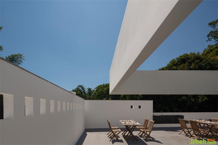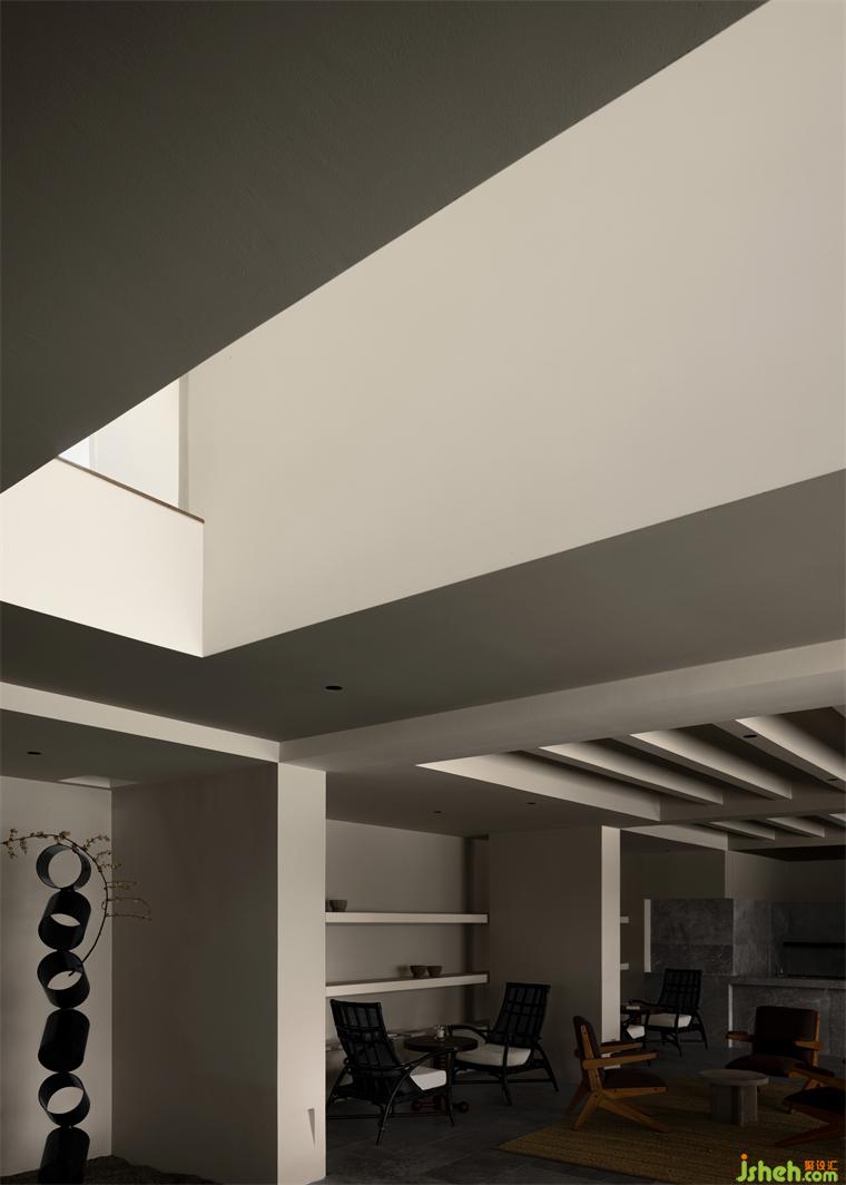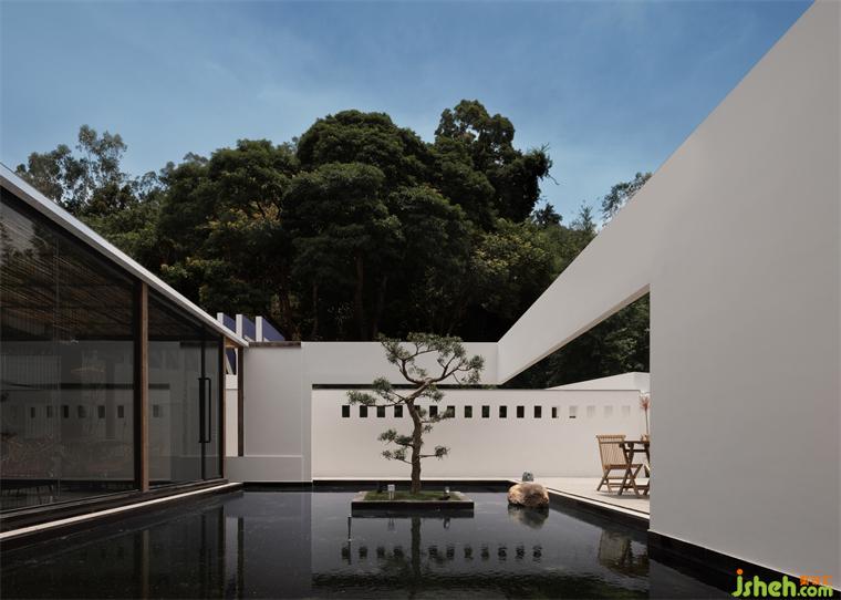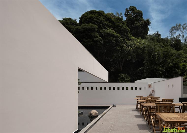 餐廳獨占一棟,微幾何的墻體如白練當(dāng)空,舒展間將兩端的建筑體塊相連,綿延的大片留白,展現(xiàn)出一種平靜的張力。其下的空間全部弱化,只留一池春水,一株松木。