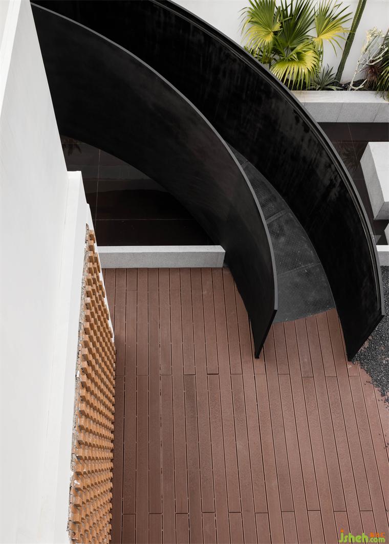 朝向陽(yáng)光的奔赴是貫穿人類歷史的主題,不僅表現(xiàn)在于室內(nèi)的向外,酒店設(shè)計(jì)也同時(shí)存在于室外的向上。朝著陽(yáng)光蜿蜒而上的黑色金屬梯,是陽(yáng)光投射下流動(dòng)的影子。它承接一種直接的溫暖,也體悟一種恒久的寓意。