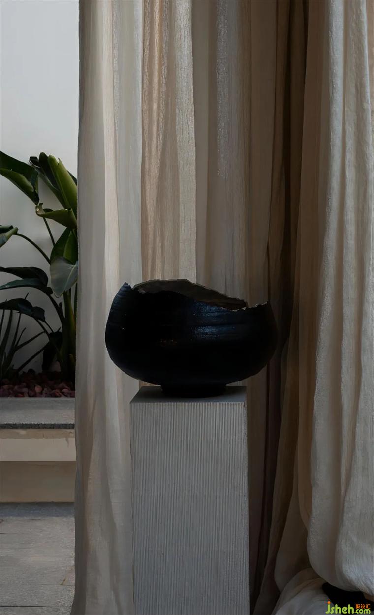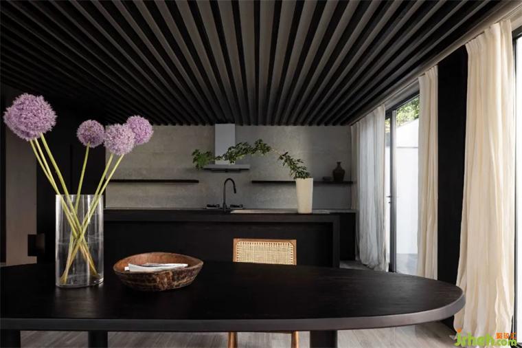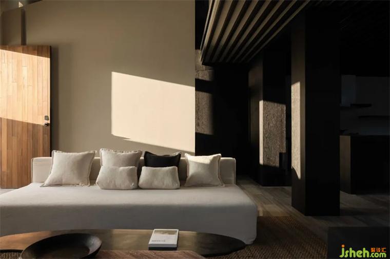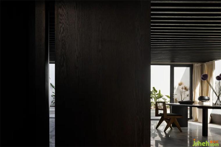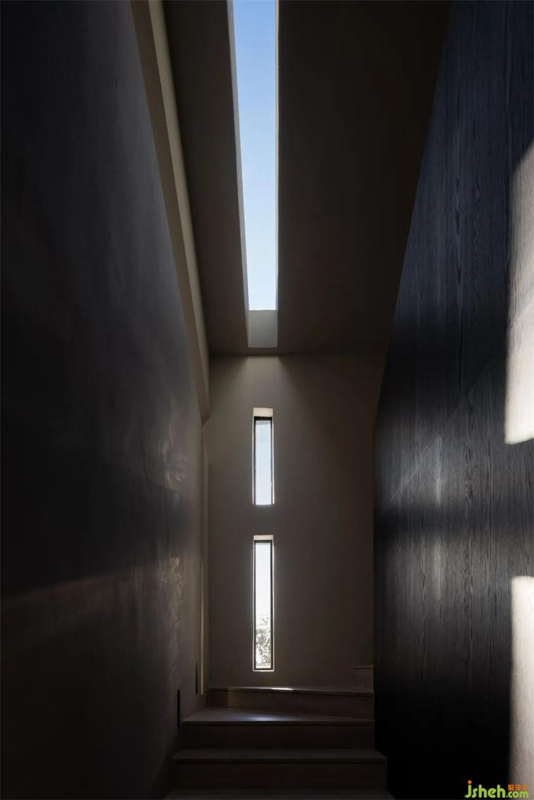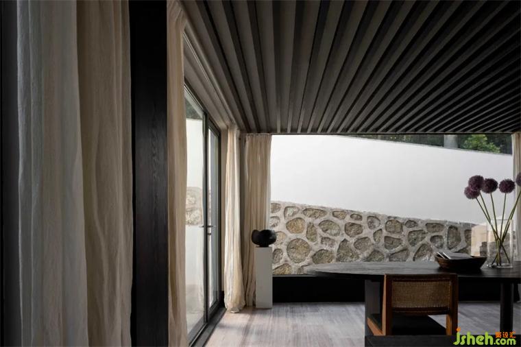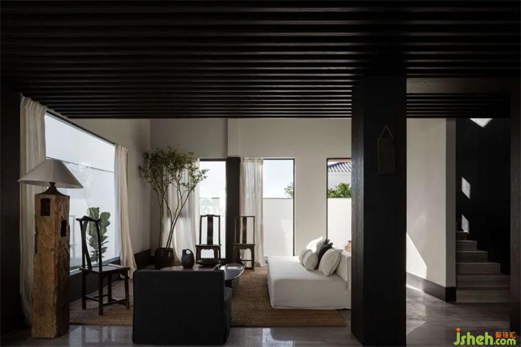 樓道間,豁然一線天光傾灑而下,不禁令人豁然開(kāi)朗;窗景外的光線作為指引的方向,引導(dǎo)人拾級(jí)而上進(jìn)入二層的空間。苫也不若林民宿設(shè)計(jì)縫隙間灑落的光線如時(shí)間的指針,隨著日照變化在黑色木飾面上緩緩劃過(guò)光的痕跡,一切仿佛慢了半拍,酒店設(shè)計(jì)暗示來(lái)者放下包袱、身心皆可閑下來(lái)。