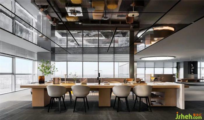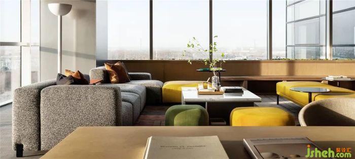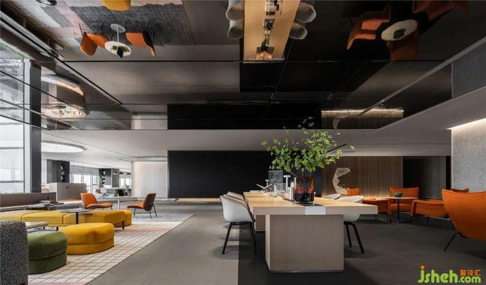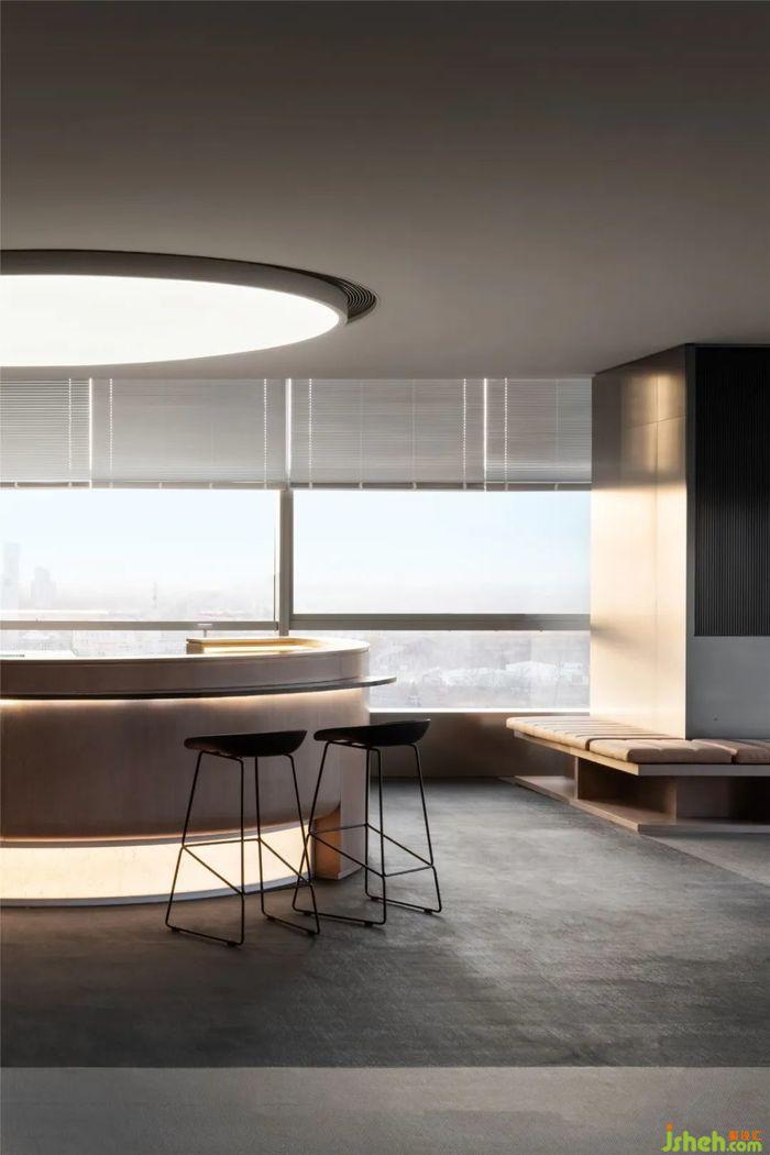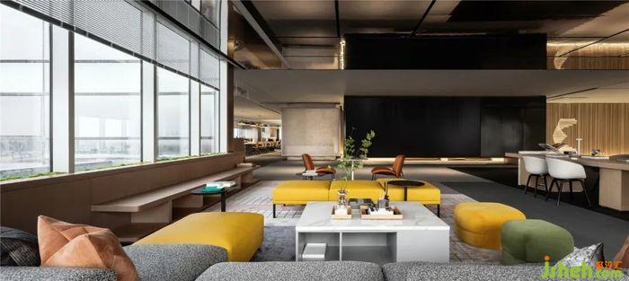 在整體風(fēng)格不變的情況下,也添加了不同風(fēng)格的空間語言,如彌漫咖啡香的空中水吧臺(tái),辦公展示中心設(shè)計(jì)落地窗前灑滿陽光的軟墊卡座,都讓空間充滿變化性與趣味性。