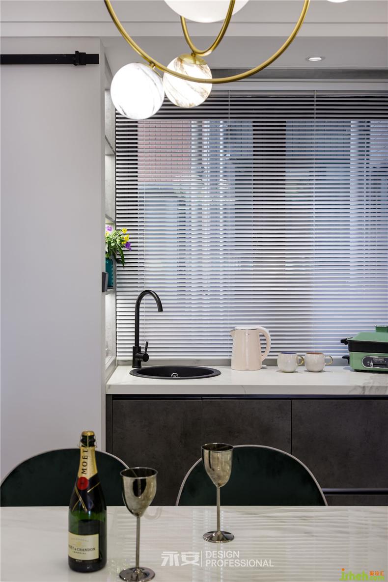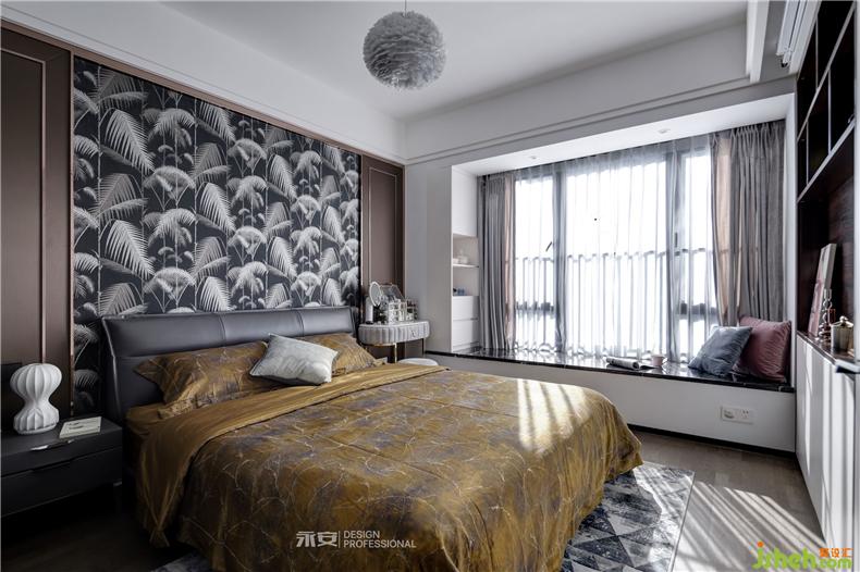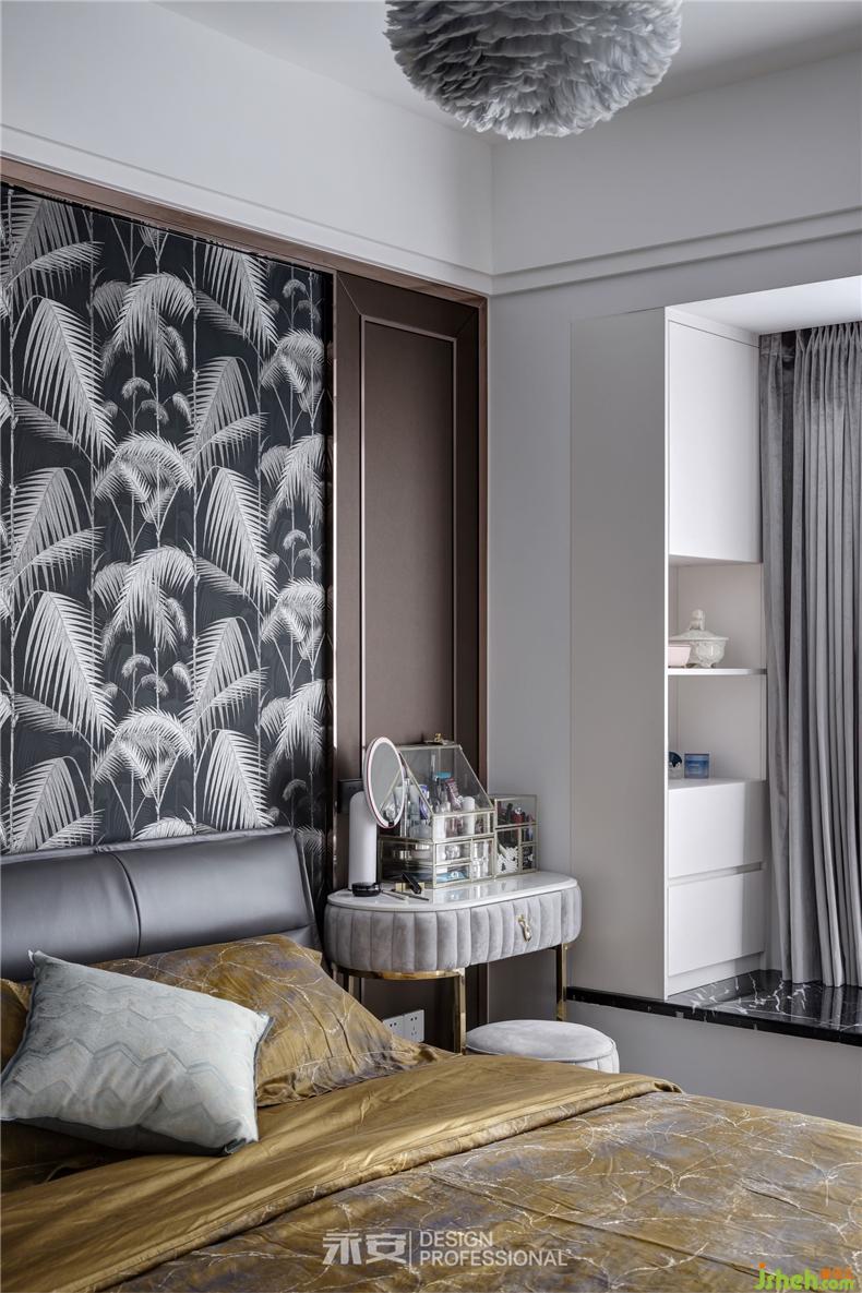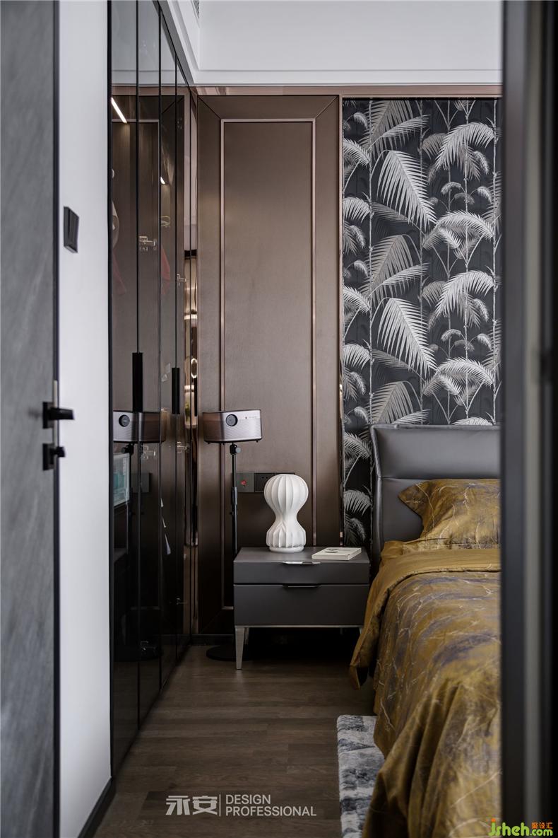 床頭是自然生趣的鳳尾竹巨幅壁畫,搭配兩邊咖啡色的飾面板,加上質(zhì)感十足的黃銅框線進行裝點,呈現(xiàn)出一種古樸而又精致的美感。在此之下,是暗金色的被單與枕套,奢華而又舒適,善于享受生活的人自然不能在枕頭與被套上委屈自己。吊頂燈的外形猶如一團漂浮著的羽毛,打開燈時,光線從羽毛間的縫隙中射出,整個主臥在這一縷縷光線的照耀下熠熠生輝