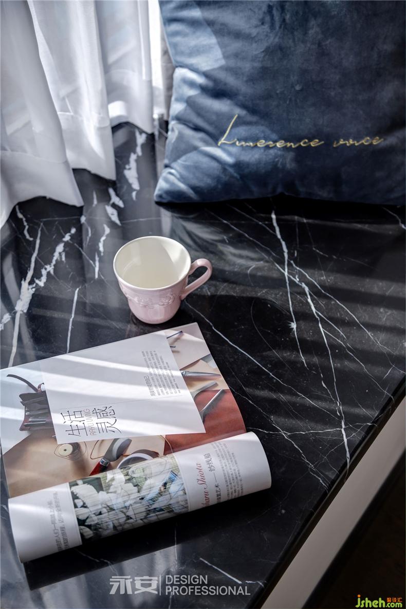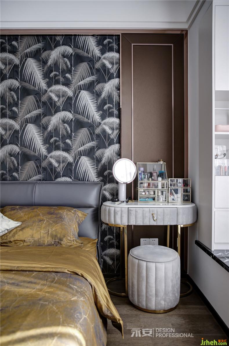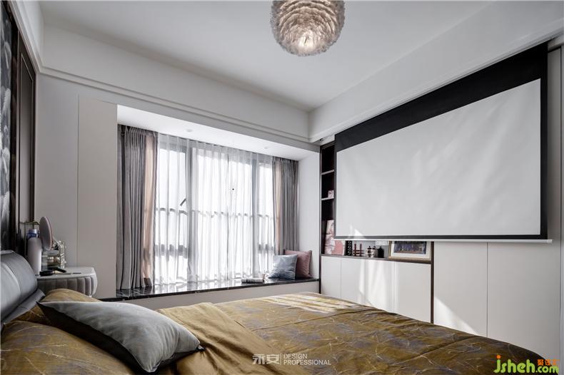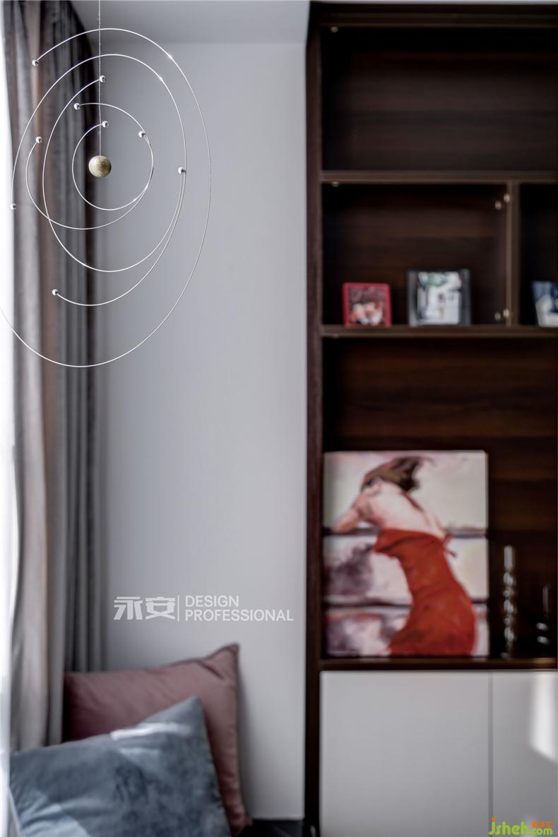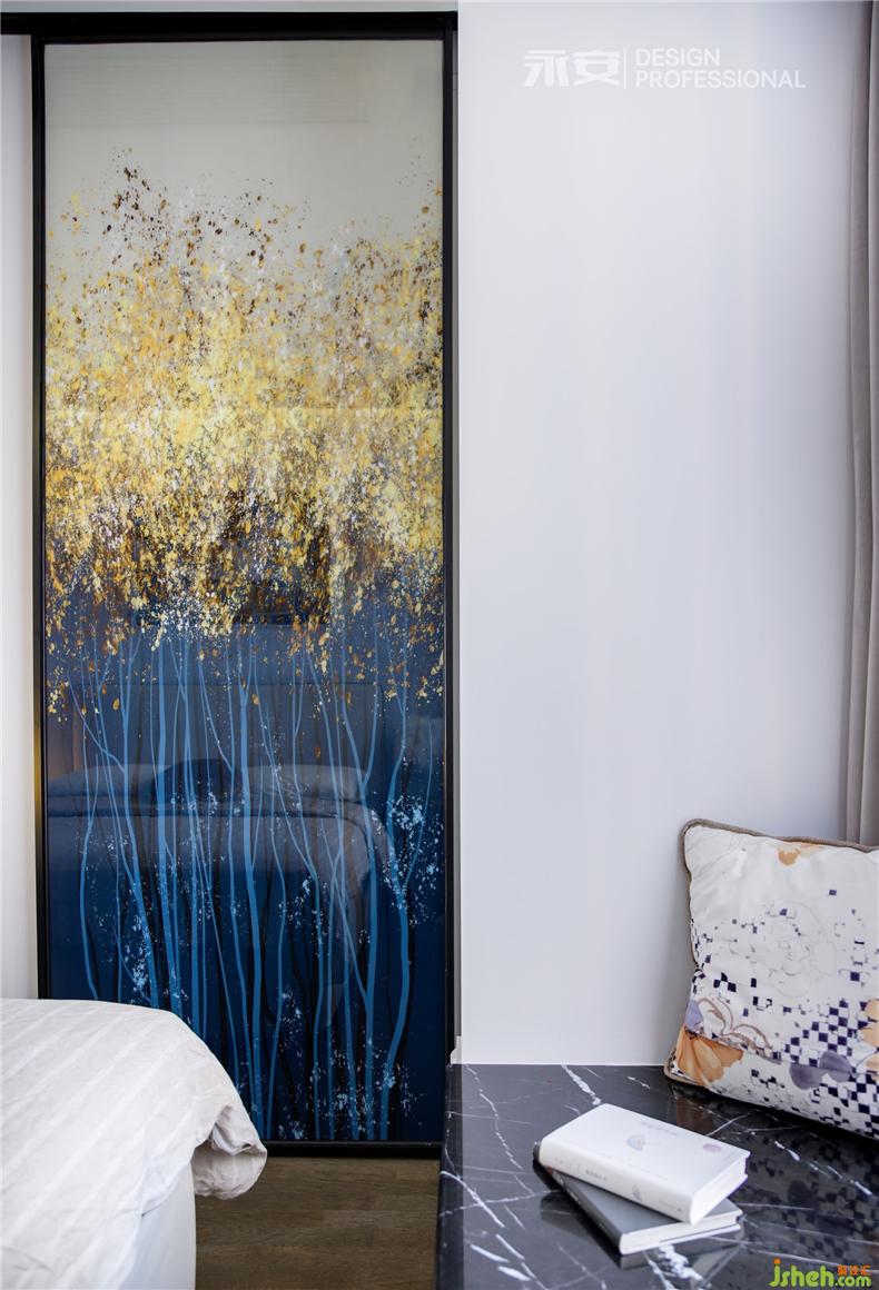 在房間內(nèi)有兩扇飄窗,一扇是視線之窗,另一扇便是床頭的心靈之窗,窗外是黃澄澄的麥田,此時剛好一陣秋風(fēng)吹過,房間里恐怕已經(jīng)滿是麥香。對面的床尾,是一幅秋季的森林,從深藍(lán)到淺藍(lán),從金黃到米黃,從下到上,色彩的過渡,讓人遐想無窮。這兩幅正在討論著秋天的裝飾畫,便足以令居住者心喜于此