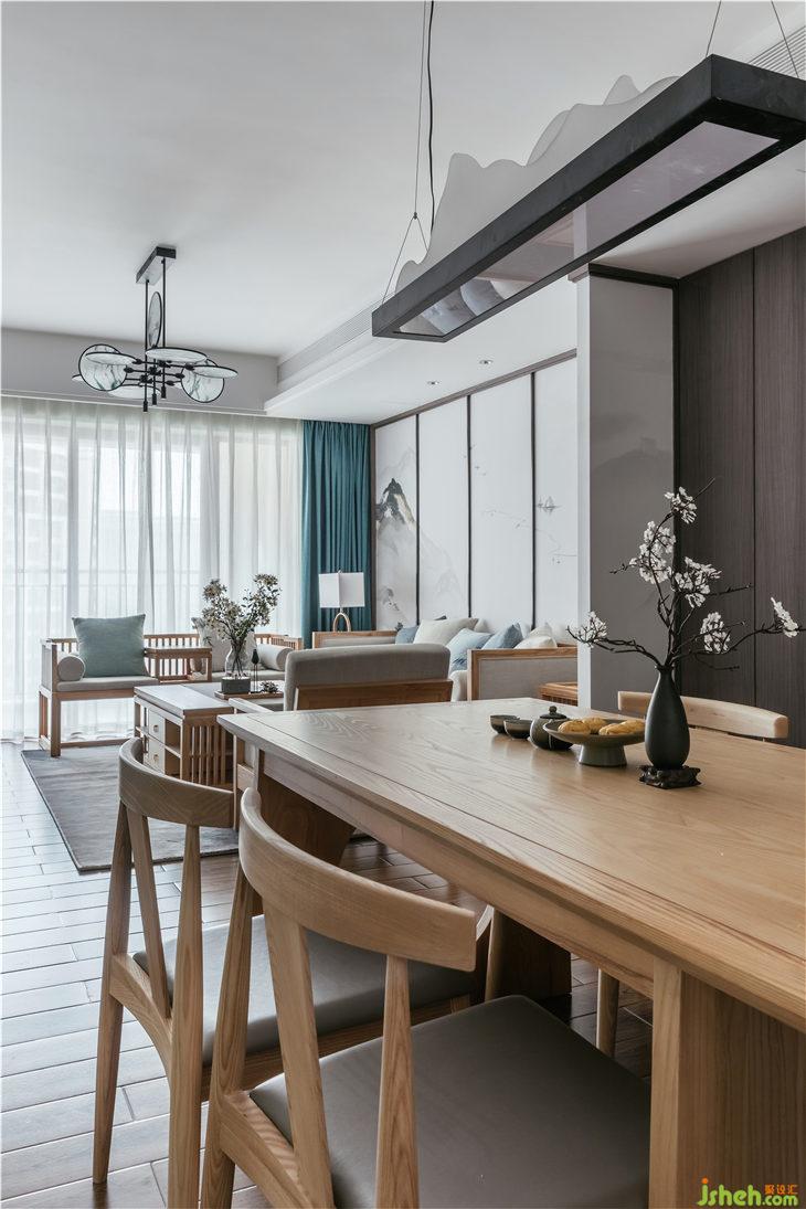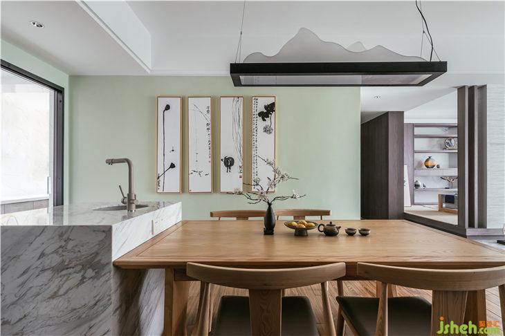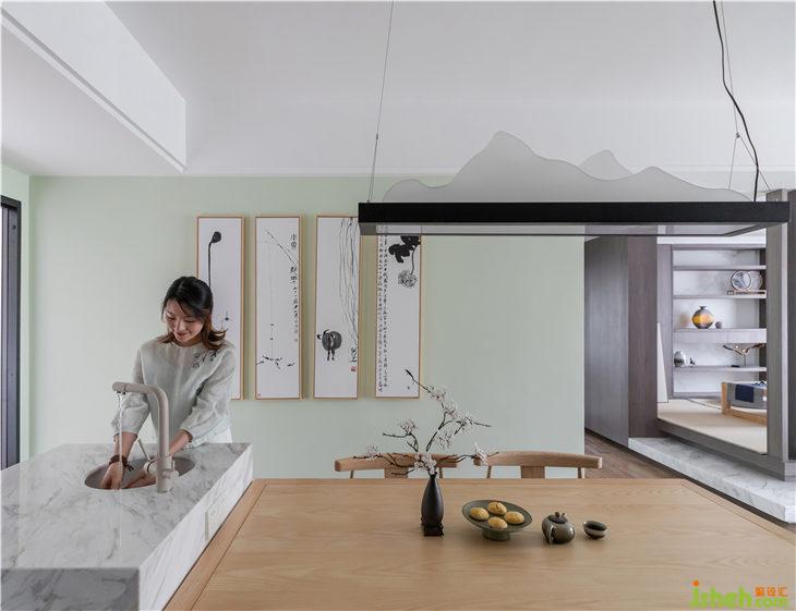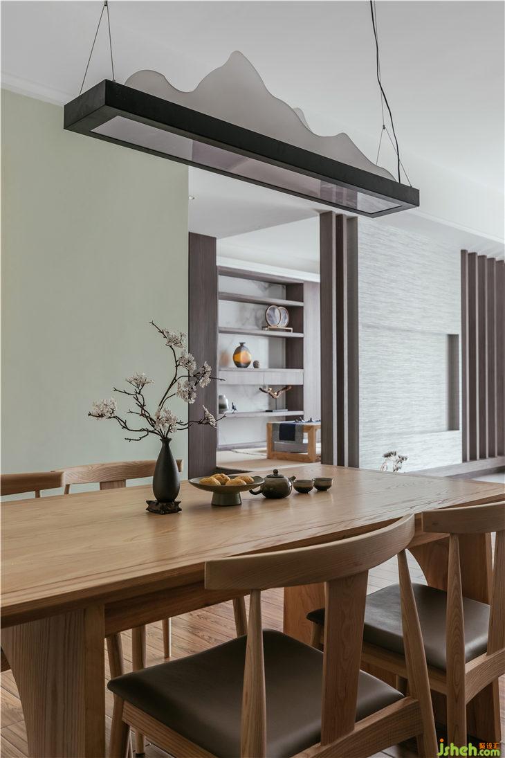 全屋采用3000K射燈,充盈著溫暖白日光色溫的家居,避免直射亮光眩暈。餐廳蘊含山水意境的吊燈,點綴間域,增添詩意。