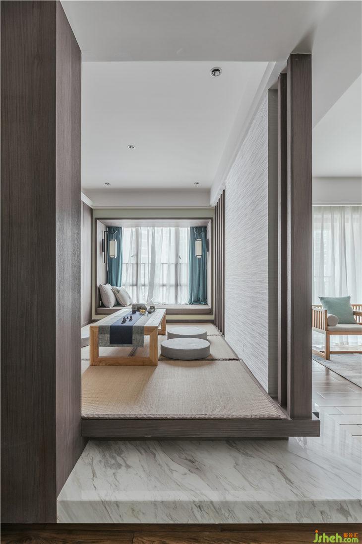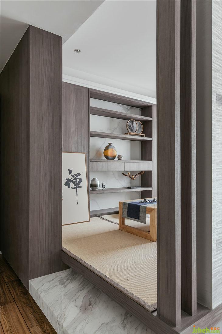 與客廳電視背景墻相連的多功能榻榻米茶室區(qū),約上三五知己,每每品茶會客,談闊風生,不失清雅。座椅底下特別配置了按壓彈簧式暗藏儲物柜,彌補家中儲存雜物功能的不足。