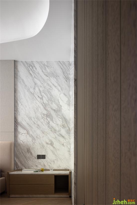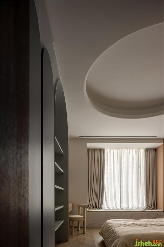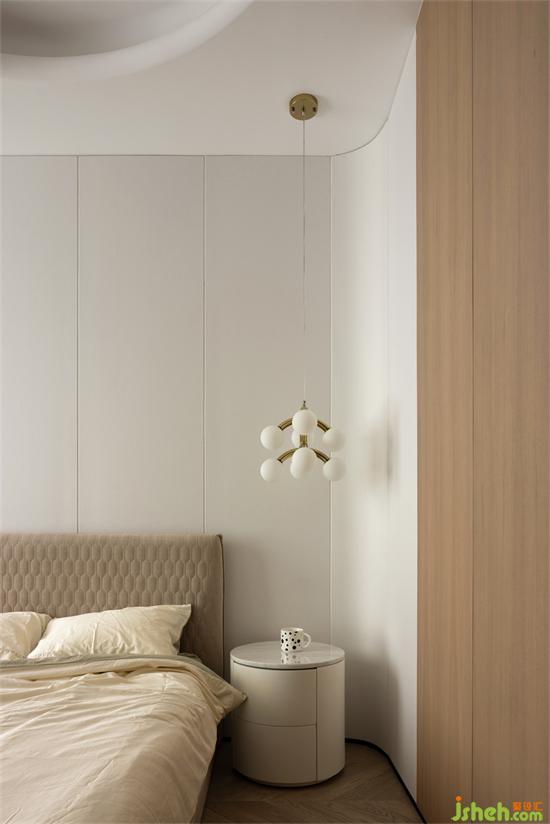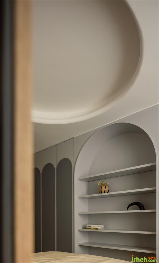 大量采用圓弧細節(jié),柜體的云朵圓形的天花造型,柔軟的布藝,象征著空間柔軟的一面。