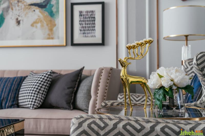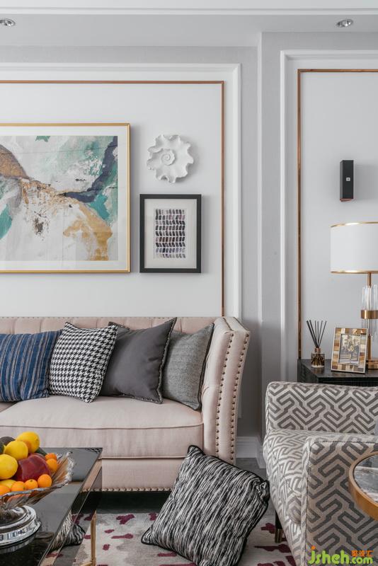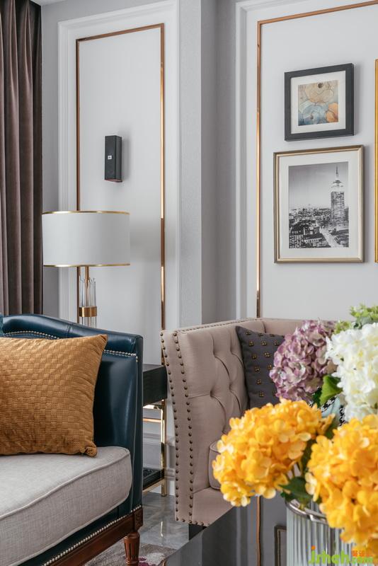 鉚釘鑲邊沙發(fā),細節(jié)吸睛。小物件裝飾增色客廳風(fēng)情。