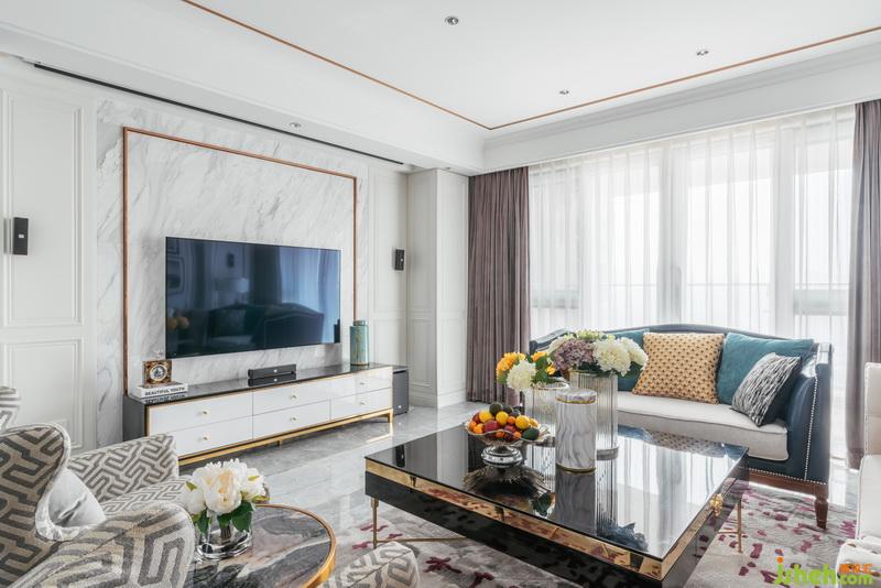 客廳,以灰白大理石紋主墻色做背景,搭配古銅色做矩形鑲邊點綴。