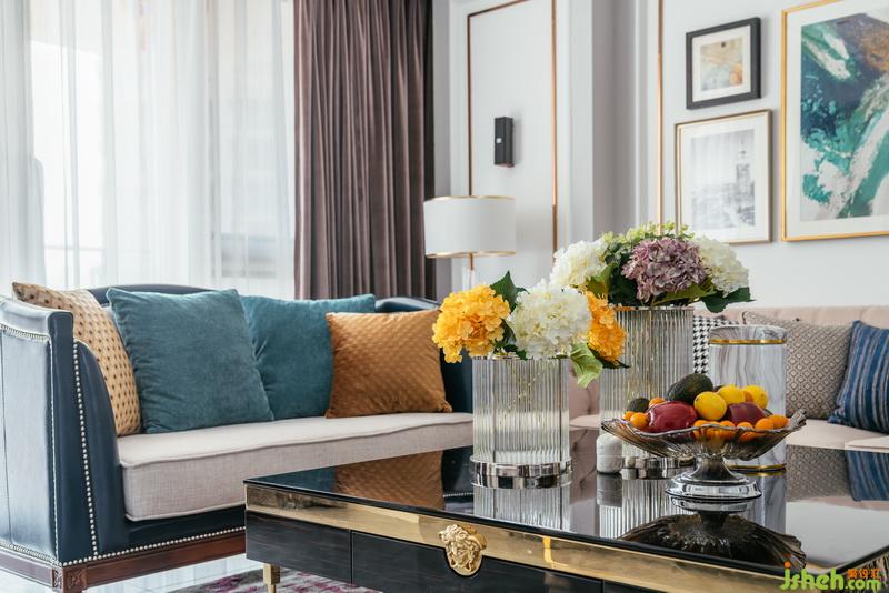 客廳擺放撞色沙發(fā)抱枕,古典中透露出奢華。
