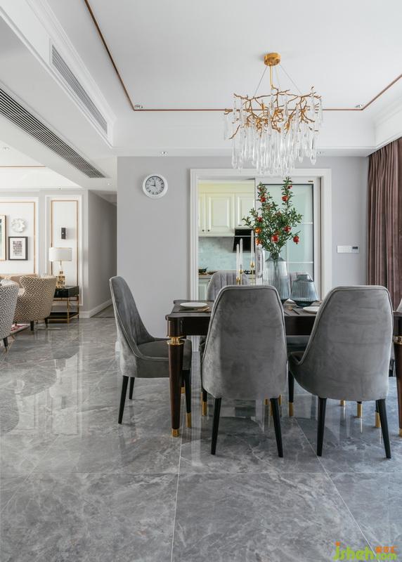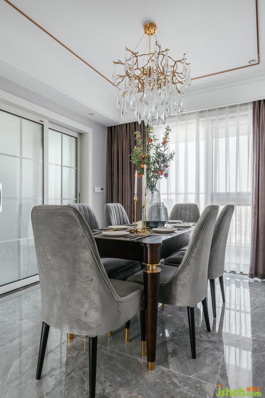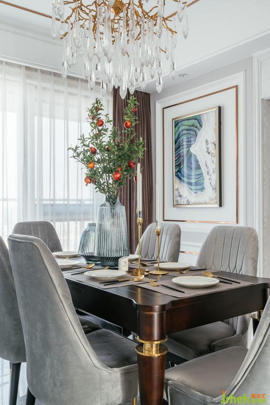 經(jīng)典美式風(fēng)格餐桌,餐廳、配色裝飾整體融合呼應(yīng),定制餐具,奢華大氣。美式水晶吊燈,細(xì)致典雅。