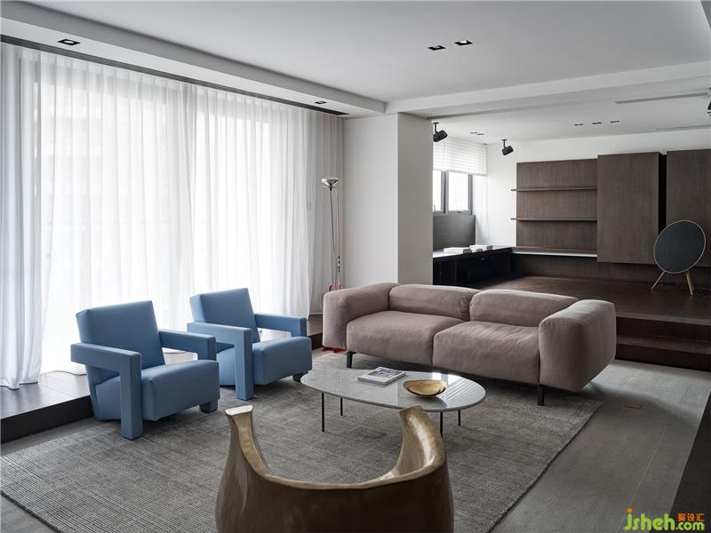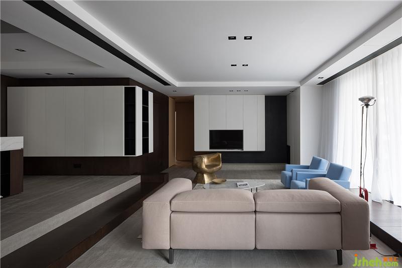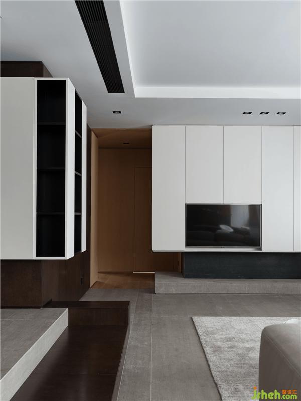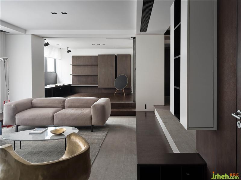 空間打破原本局促的格局,從入口處開(kāi)始規(guī)劃出一條干凈利落的空間動(dòng)線。以地臺(tái)高低的變化將客餐區(qū)一分為二,客廳利用四周靈活可抽動(dòng)的踏板臺(tái)階為界,同時(shí)回型合式踏板塑造出空間的體塊感。
