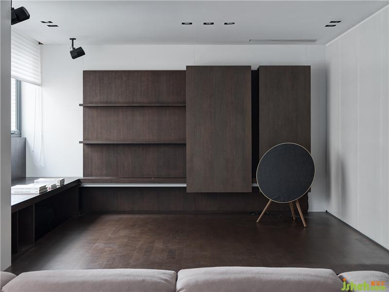 客廳后方介于公私領(lǐng)域間的多功能室,既是待客之處,也是娛樂(lè)之所。半閉合推拉門(mén)的變化,提供了或開(kāi)放,或私密的空間選擇。室內(nèi)設(shè)計(jì)師