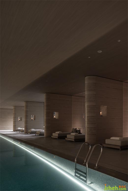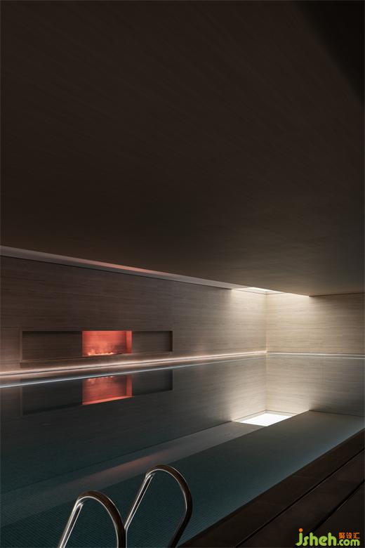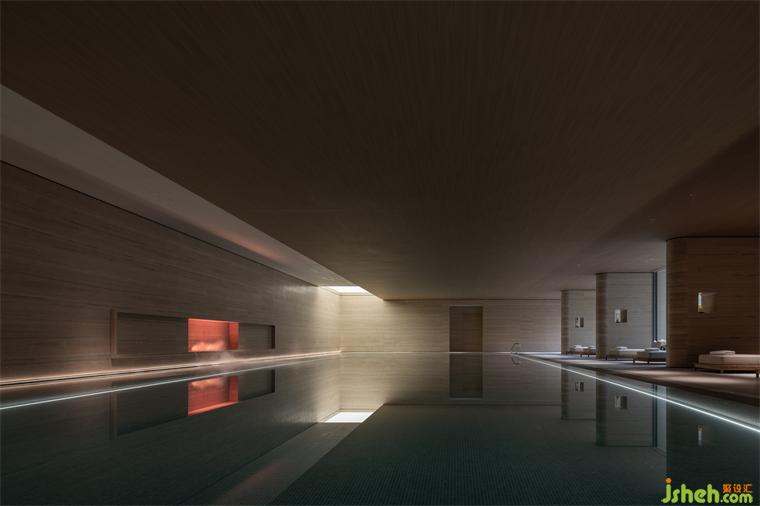 游泳區(qū)域的設計旨在營造一種獨特的序列感,使人在其中體驗到時間的流逝,同時與室外環(huán)境進行有機的連接。采用了一系列秩序墻體的空間序列,通過曲線設計與錯落的開合關系,引導人們在游泳過程中感受到節(jié)奏感與空間的變化。