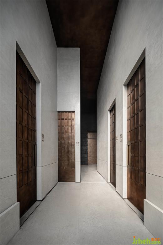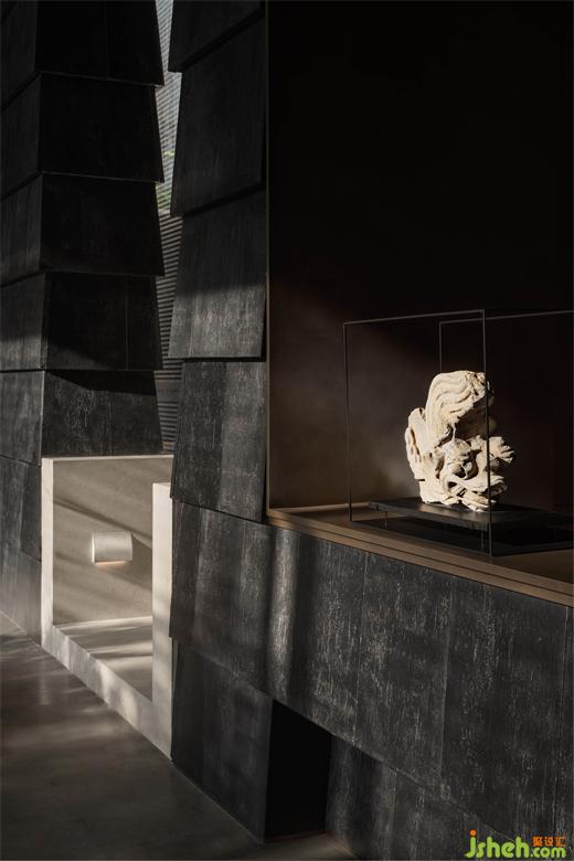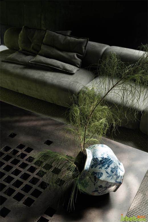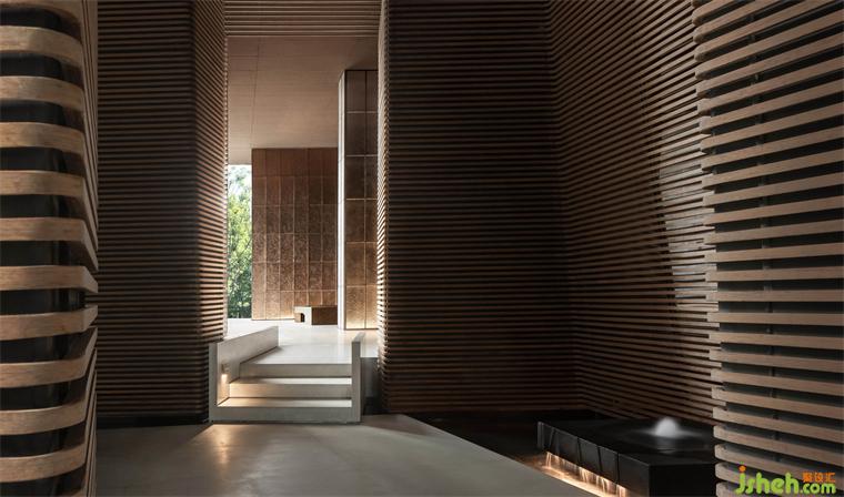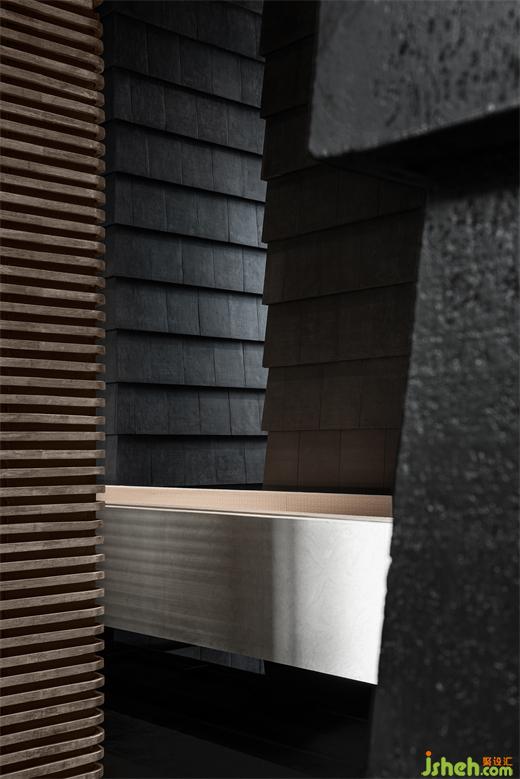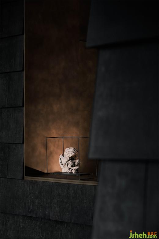 墨色的陶板如自然的瓦片,隱含著山間廬舍的質(zhì)樸柔和。案牘之上的瓶花清供,折射出插花之人的意趣和性情?!八故锹?,惟吾德馨”,清雅之物的擺放使東方的審美意境在當(dāng)下的空間中延續(xù),光線透過VIP室底部的開合縫隙,與庭院之中的蔥翠融為一體,如畫般通透美好。