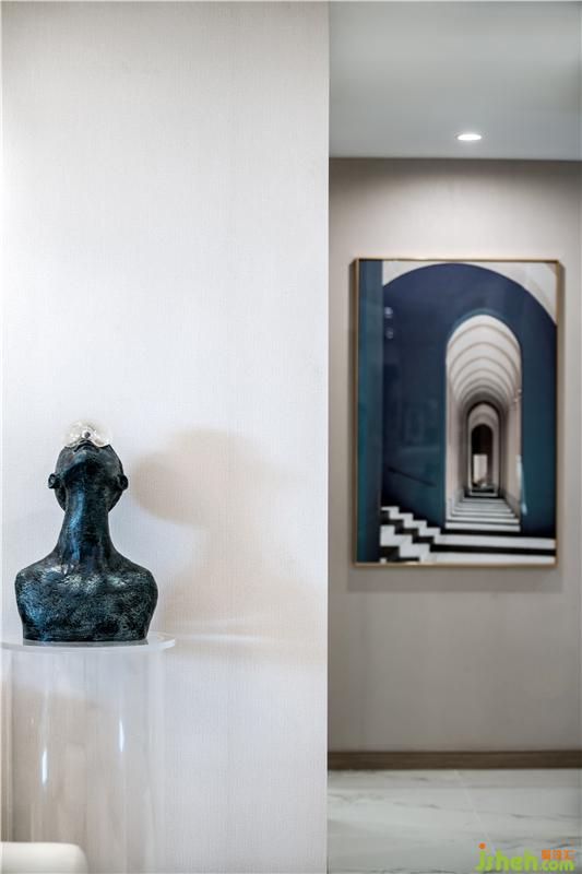 仰面思索的人物像是與世界對(duì)話,尋找內(nèi)心的未解之謎;設(shè)計(jì)師巧妙地將思維精神隱性于空間之中蔓延,藝術(shù)裝置的運(yùn)用,營(yíng)造極致的視覺(jué)和極具張力的空間感受,如同一種態(tài)度或宣告——這里將成為與以往不同的生活居所。