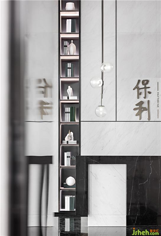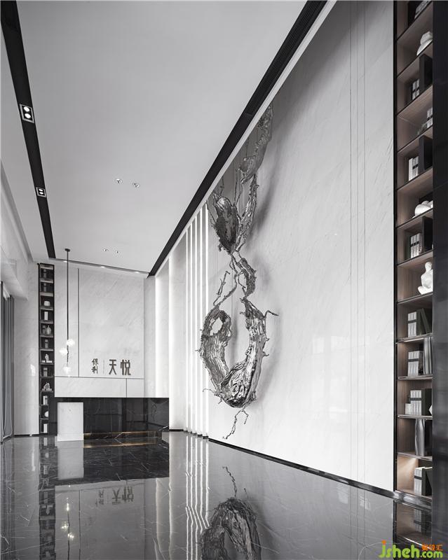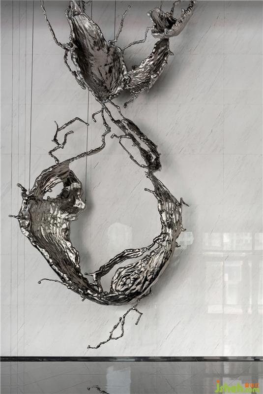 步入前廳,鋪陳大面積的爵士白大理石作為空間主色調(diào),干凈而通透的玻璃幕墻,將自然與光線似有似無置于交互之間。懸掛正中的藝術裝置“煙霧水墨”如煙塵繞阿繞的,像霓裳羽衣的袖,曼織長帶,千絲萬縷在玉臂的香氣里揮灑著如密密的網(wǎng),繚繞住整個空間情感,始之奔騰,綿綿收羅。