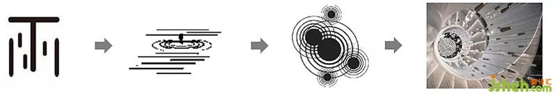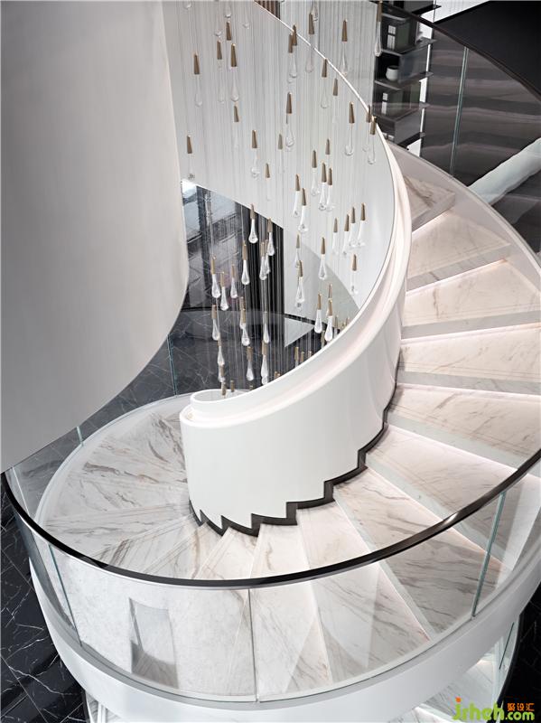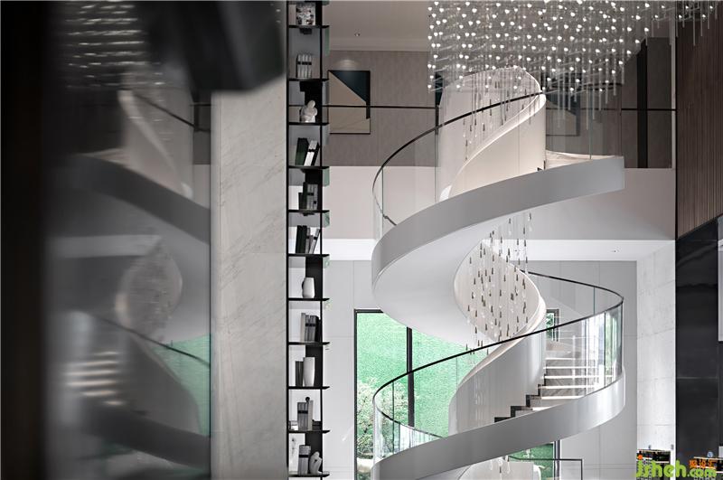 順延空間肌理走至一端,蜿蜒而上的旋轉(zhuǎn)樓梯成為空間之間的轉(zhuǎn)承,流暢的弧線呼應(yīng)著建筑結(jié)構(gòu),線于面的切換如同舞動(dòng)的水袖,凝結(jié)了時(shí)間與氣韻,猶似霓裳羽衣舞。場(chǎng)域在空氣中發(fā)散著,梯間如螺旋般穿透氛圍,在放射中被浸染,醞釀出現(xiàn)代的東方韻致。