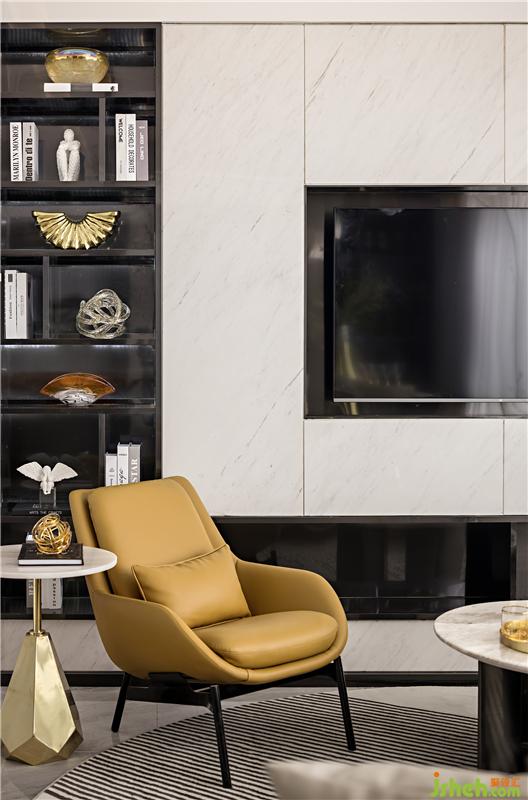 雅士白大理石溫潤而遒勁,隱約可見的自然肌理,化作簡約凝練的飾面形塑空間意境;橙色的局部點綴蘊藏著無限的生機,如同樂章的旋律,在整個空間中變奏交響,悅耳動聽。