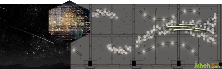 大廳陳設(shè)汲取詹姆斯·麥克納布的藝術(shù)表現(xiàn)形式與制作理念,營(yíng)造了藝術(shù)質(zhì)感和線(xiàn)條構(gòu)成美的入口氛圍。前廳背景中的星座剪影,如同梵高筆下的《星空咖啡館》,引發(fā)另一個(gè)層次的場(chǎng)域吸引力,閃爍著別樣的光芒。