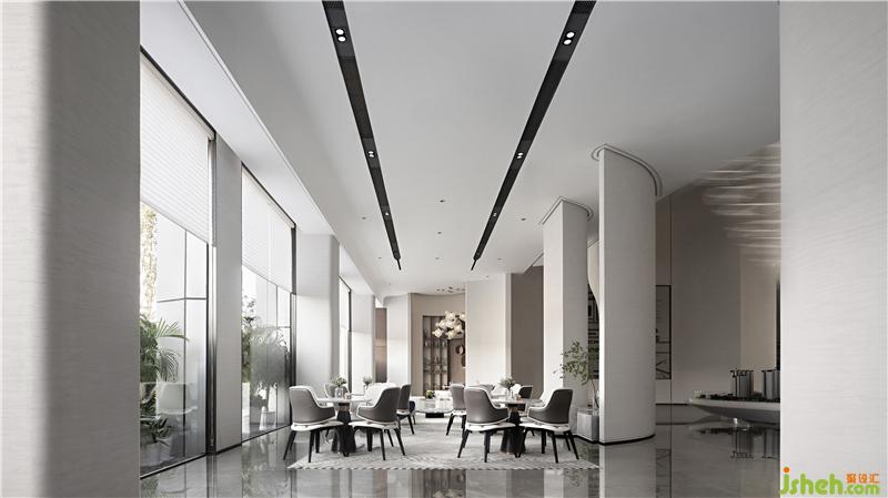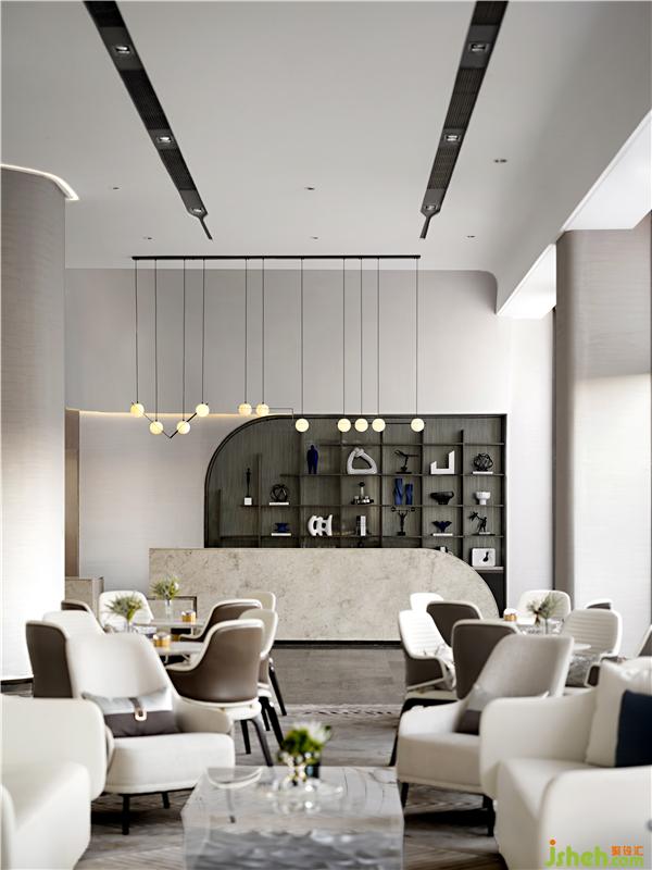 空間以米白色為基調(diào),大膽加入引自靜謐藍為點綴,自然、光影與空間交相融匯,如同清晨陽光灑在江面時的水光瀲滟之景,從靜謐中感受視覺與精神的心之所向。