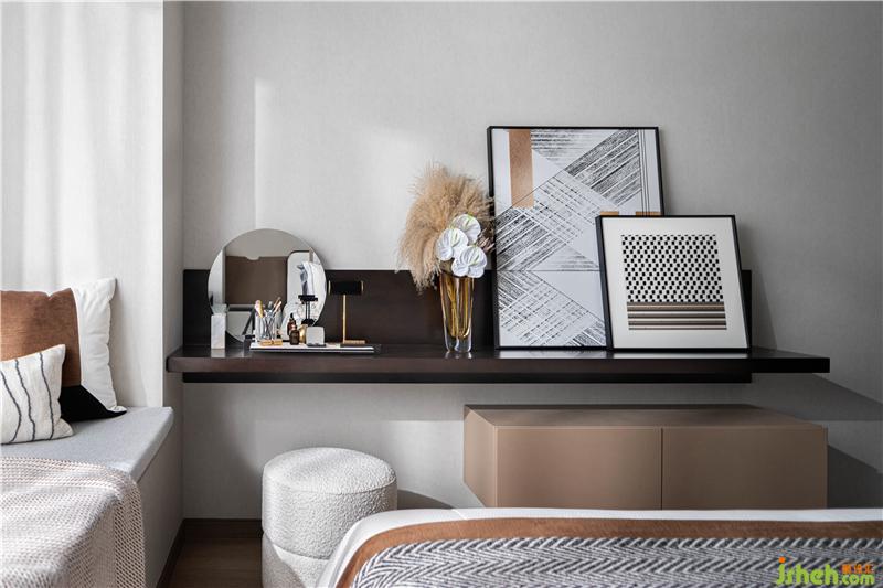 高雅溫厚主臥注重打造舒適、品質感,帶來豐富的視覺享受。流暢的布局和舒適的尺度,精選皮革,精裁成細條,層次堆積的藝術掛件,鄭州樣板房設計包容精致的生活態(tài)度與生活的鮮活烙印。
