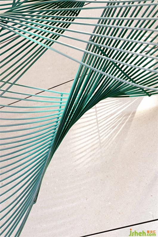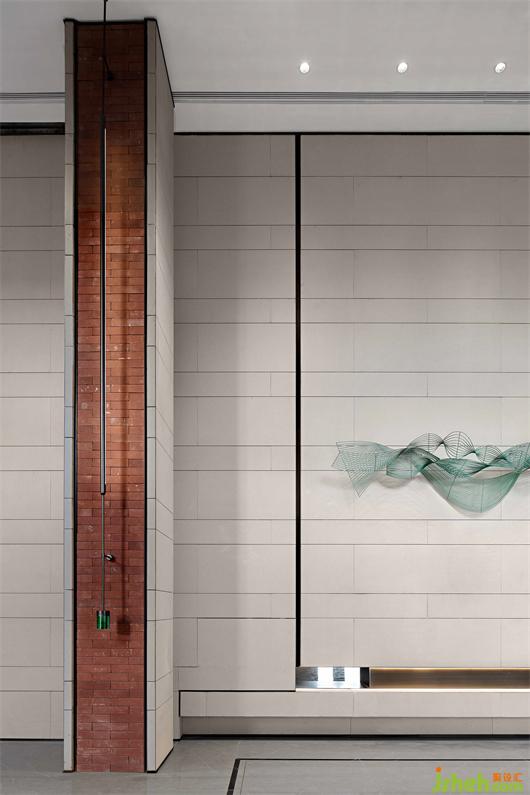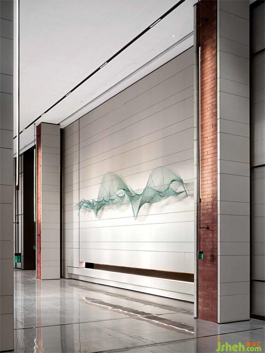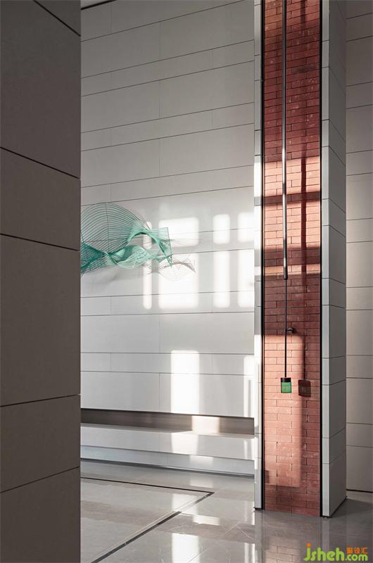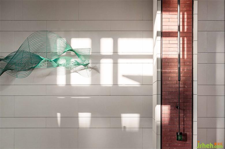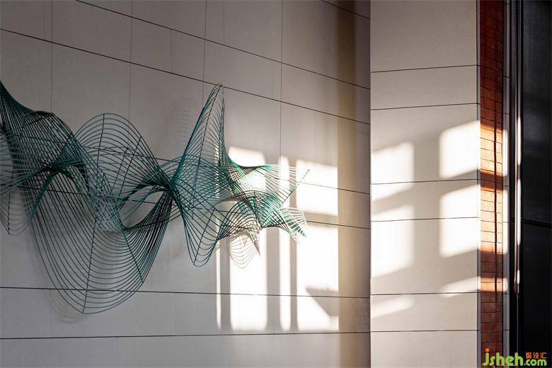 簡潔的墻壁,綠色線條仿佛一圈圈年輪的肌理,與游弋的光線彼此互襯,形成一幕凸顯藝術(shù)精神的藝術(shù)裝置。墻壁猶如畫布,裝置在其中輕盈的作畫。