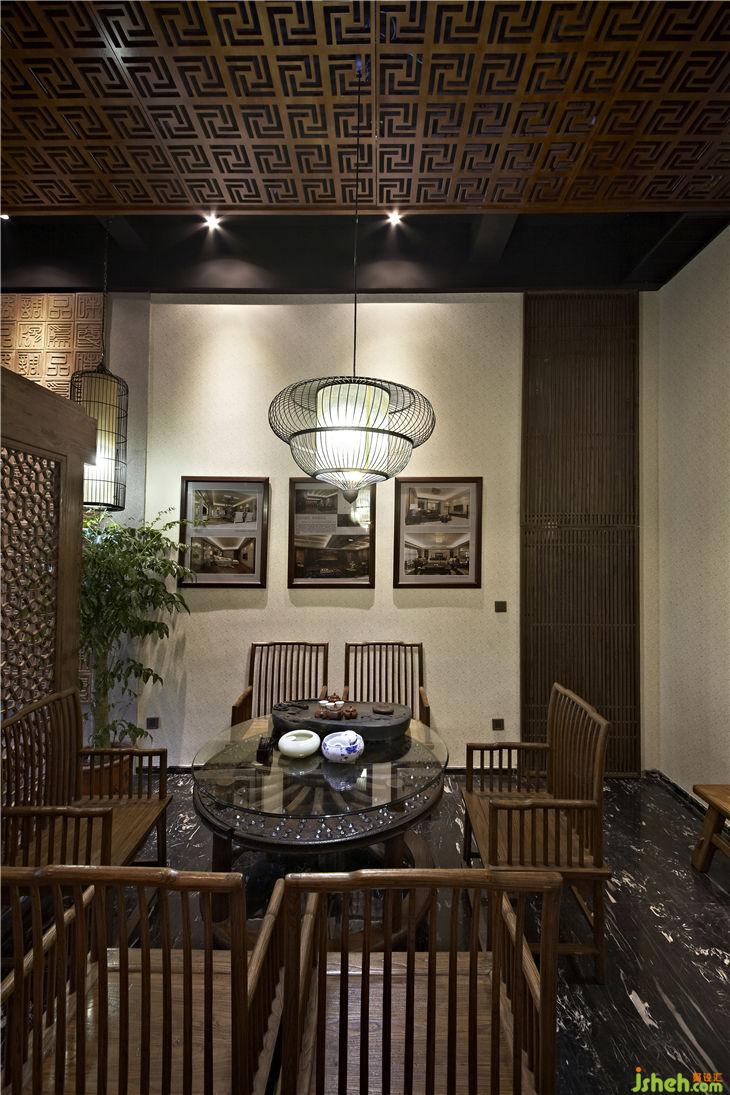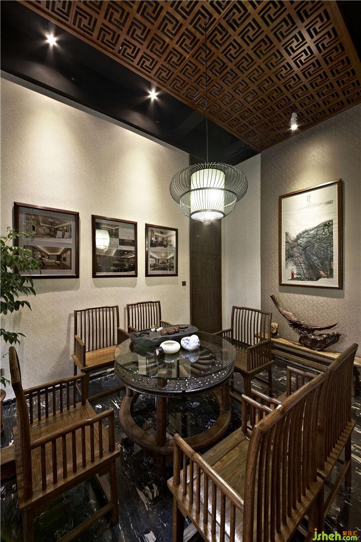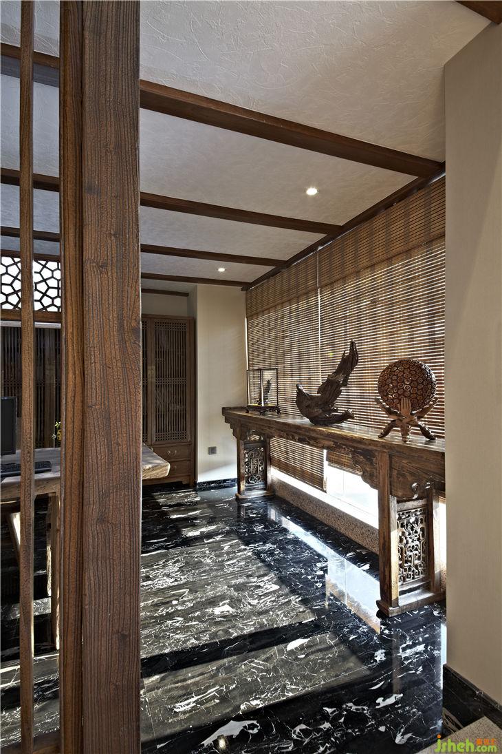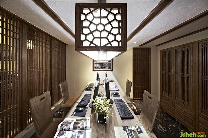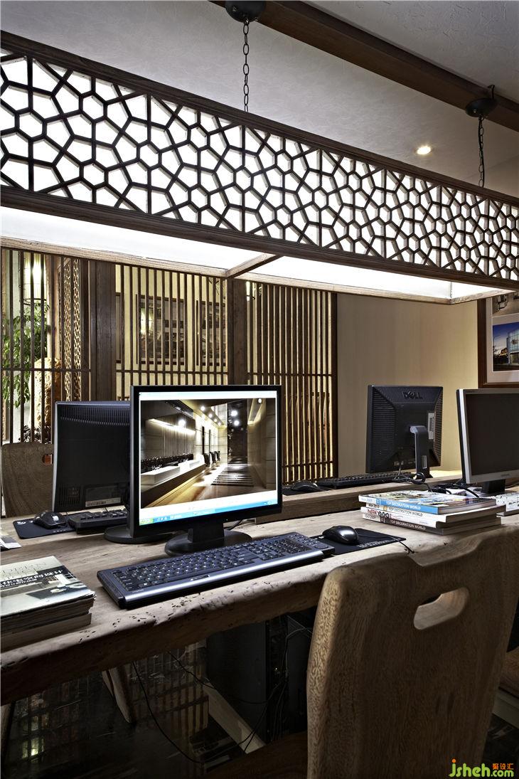 榆木屏風后是接待區(qū),品茗圓桌是古老馬車輪改造而成,失去原來價值的馬車輪恰到好處的找到它的棲息地,靜靜地訴說歷史的變遷和歲月的悠久;純自然的樹干工作案臺,不加任何修飾、雕琢,流露出木質(zhì)自然的本色,樹皮的凹凸及自然肌理毫無掩飾的展示,宛如素面美人的清純和輕盈,把設計語言還原到最原始的純粹和簡潔。落地玻璃窗戶掛著竹簾,陽光透過竹簾縫落在玻璃窗下古老的案幾上,青翠的綠蘿、典雅的青花瓶,似乎在相互傾訴!歲月無聲,而古老的設計語言、設計元素還在延續(xù),還在體驗……
