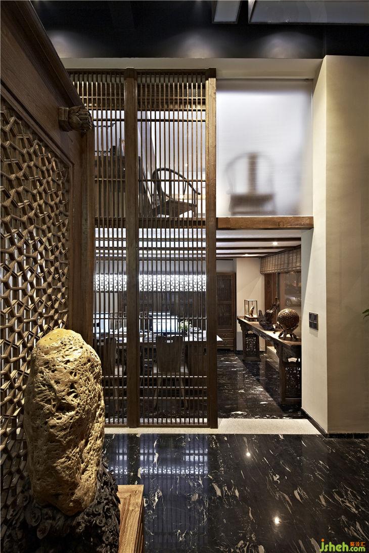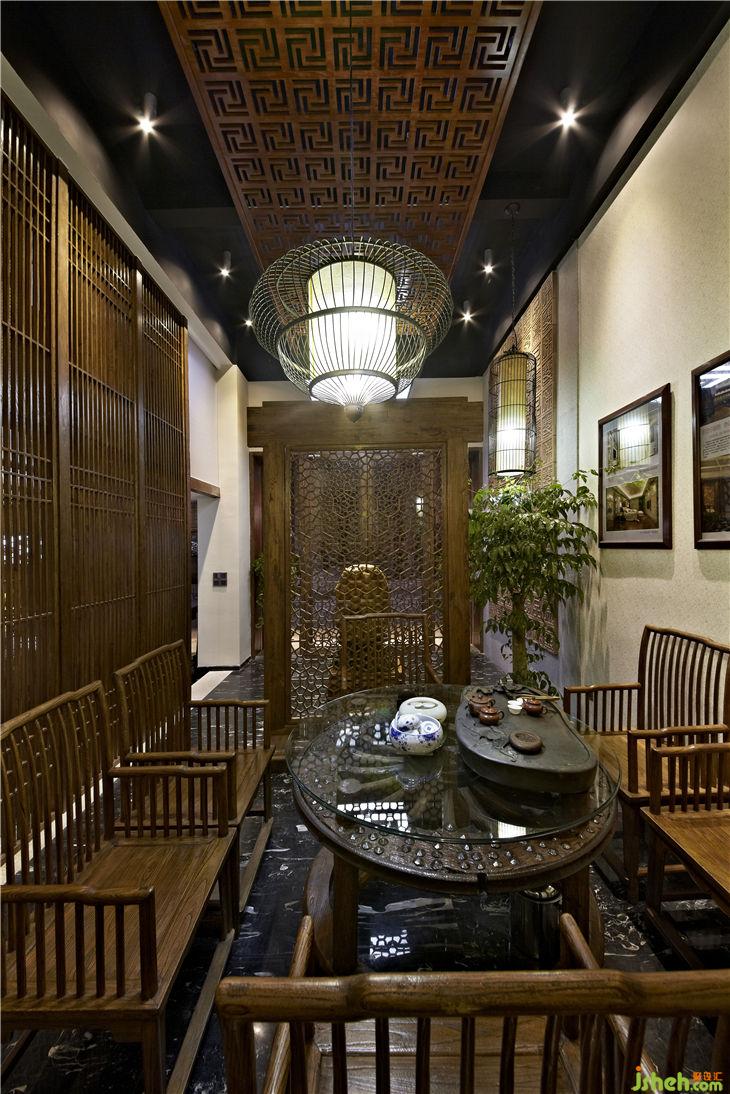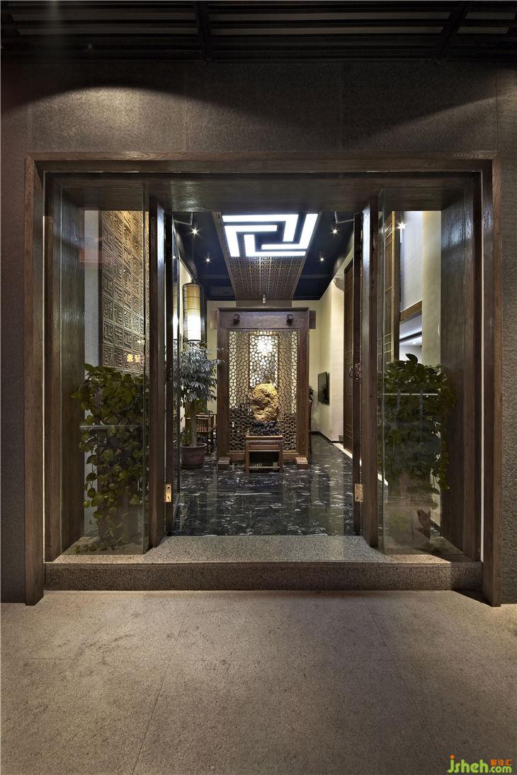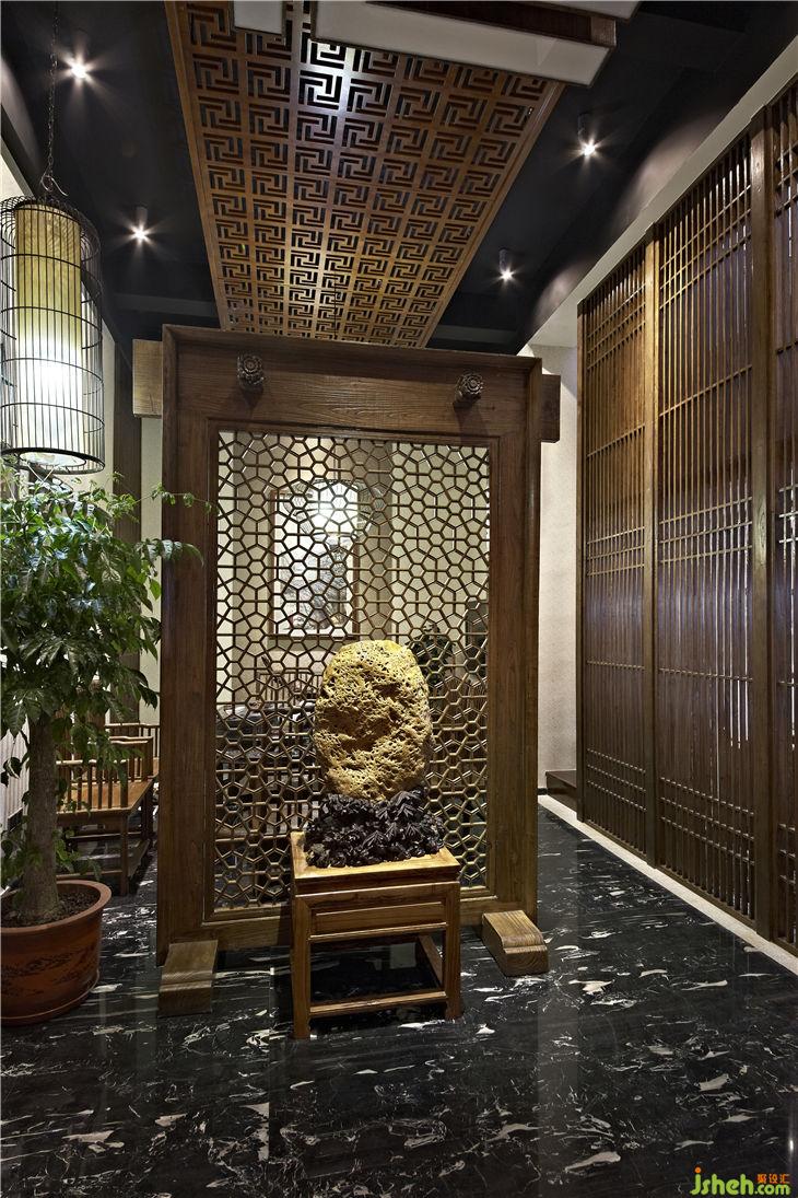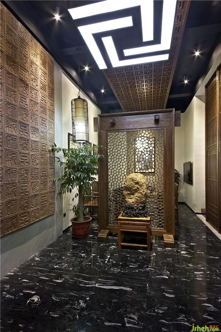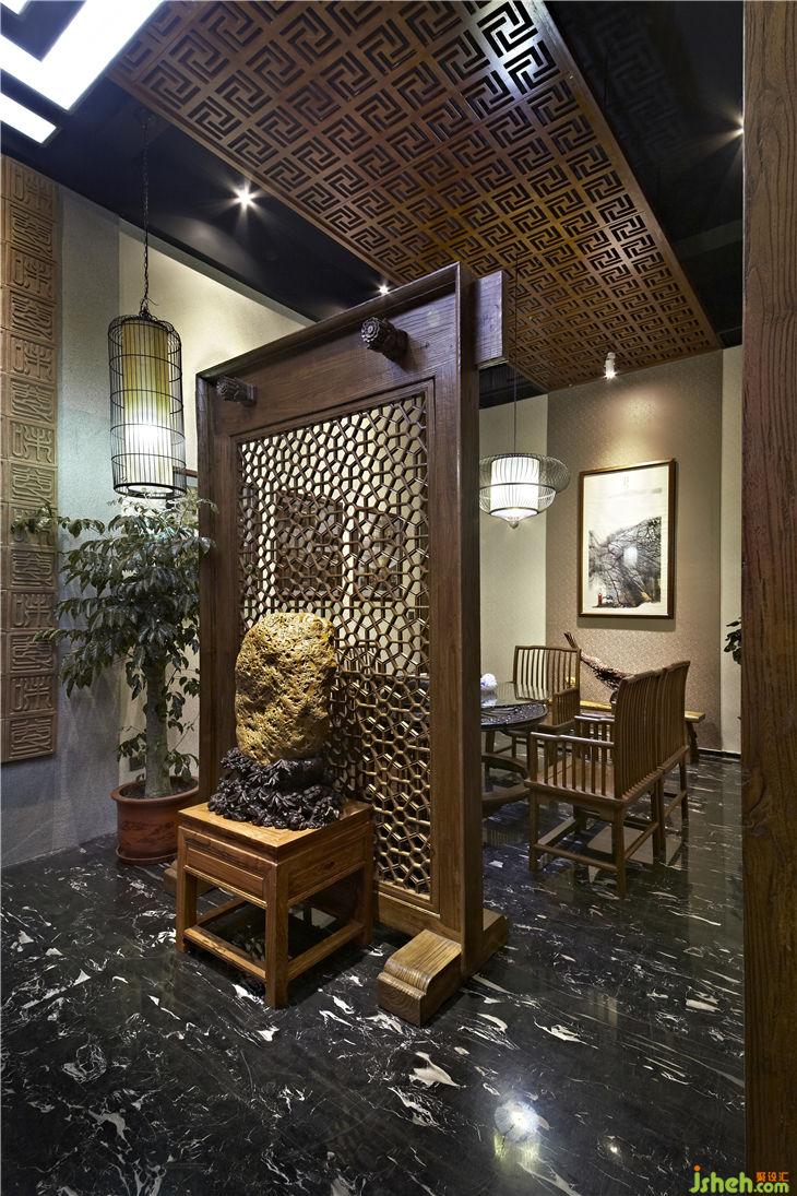不同功能區(qū)之間以落地榆木直條窗欞做隔斷,不僅渲染出一種東方文化的文人風(fēng)范的古韻美,同時(shí)也體現(xiàn)現(xiàn)代設(shè)計(jì)上“似透非透”的視覺效果和“意到筆不到”的書法韻味;暖暖的陽(yáng)光透過鏤空?qǐng)D案的榆木屏風(fēng),益顯風(fēng)搖疏影動(dòng),給人一種心靈安逸與心境的閑靜。用正格設(shè)計(jì)標(biāo)志的圖形重復(fù)構(gòu)成鏤空雕刻的榆木板,懸掛在黑色的天花上,貫穿門廳與接待區(qū),溫馨傳遞著企業(yè)文化與精神,傳統(tǒng)樸素的語(yǔ)言在現(xiàn)代的空間中悄悄的融合、互相滲透,賦予整個(gè)空間的和諧情調(diào)。