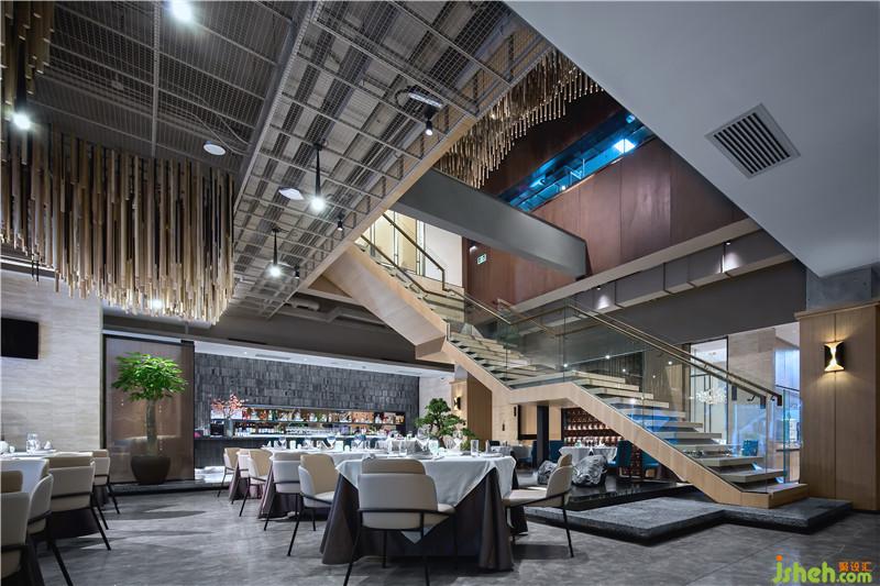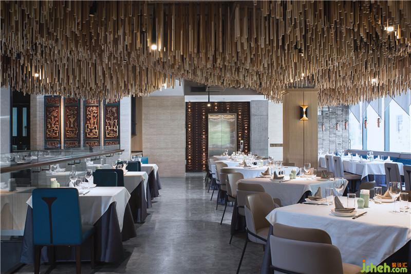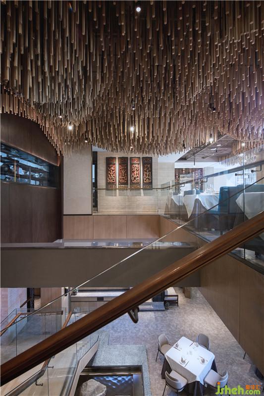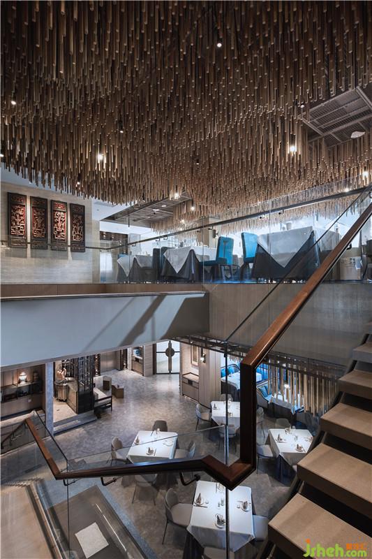 拾階而上,天花上傾瀉而下的“搟面杖”裝置如山水連綿起伏.設(shè)計公司