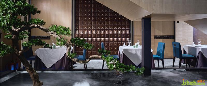 步入餐廳,一層主要作為公共空間使用,以散坐形式存在,中心區(qū)域特別設(shè)置了中央水景。The first floor of the restaurant is utilized as public space with spread-put seats. Water decoration has been installed in the center of the premise.