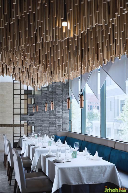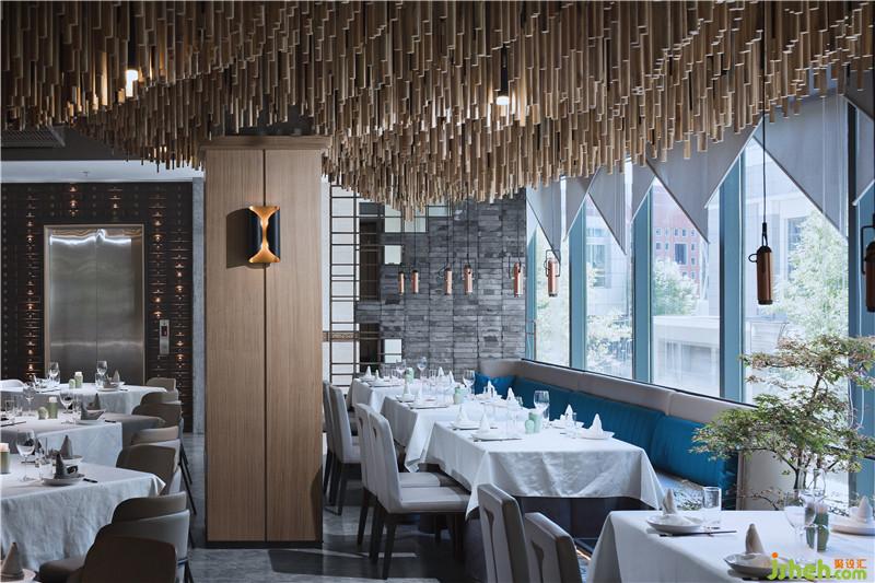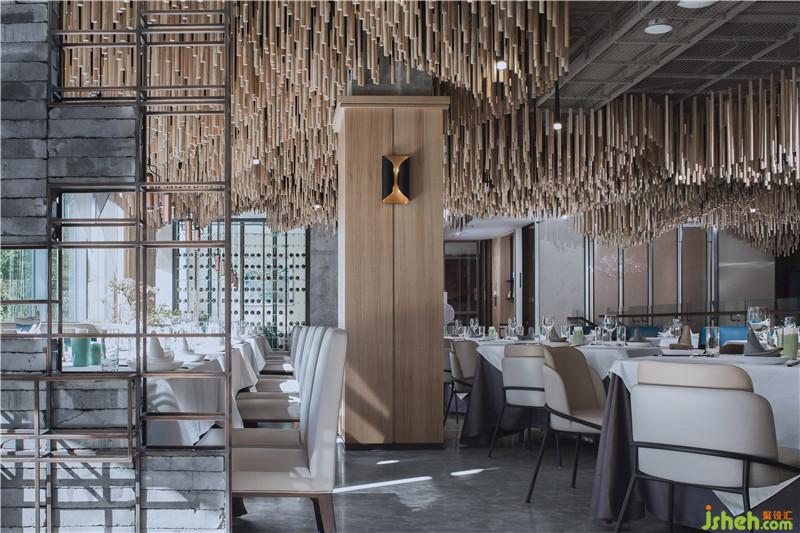 二樓延續(xù)一樓的主色調,整體空間靜謐而舒適,一側靠窗的位置充分保證室內的光線,便隨著天花藝術裝置灑落而下。The main color tone extends to the second floor, maintaining the serenity of the dining hall. The window-side seats provide ample light for the hall, which shines down from the ceiling.