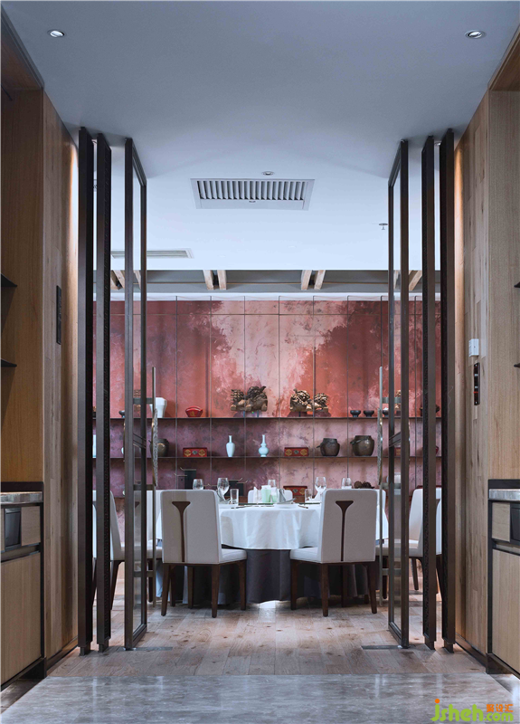 二樓最大的驚喜是一端盡頭的小型宴會廳,可用作聚會的場所,墻面使用了肌理漆,將故宮紅墻的掠影引入室內(nèi)。The most surprising space on the second floor is the small banquet hall at one end, which may serve as conference room. Verniciai coating is used on the wall, which is similar to the red wall of Forbidden Palace.設(shè)計公司