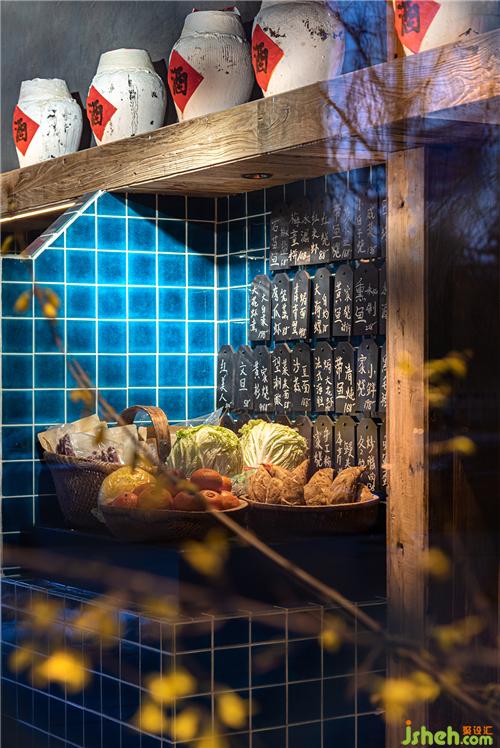 雖然餐廳空間有限,但在金融街,人們對(duì)充滿市井煙火的好奇和需求要遠(yuǎn)遠(yuǎn)大于對(duì)一間酒吧,而兩種截然不同的經(jīng)營(yíng)體驗(yàn)也會(huì)在同一個(gè)空間中形成沖突。于是,在粗礦的拼接青石板墻內(nèi),老木頭搭出海鮮檔的結(jié)構(gòu)框架,竹簾、青石條、水泥、水藍(lán)色方磚還原了檔口熱鬧的氛圍,陳年老酒、菜籃、鮮活水產(chǎn)和氤氳的水汽無(wú)一不是人聲喧鬧的市井底色,在暖黃色的燈光里,這一塊被框起來(lái)的“煙火氣”兀自站在金融街的繁華里,甚至有點(diǎn)不合群,卻格外引人入勝。