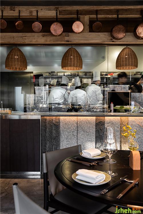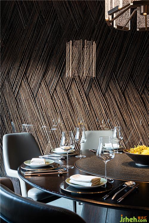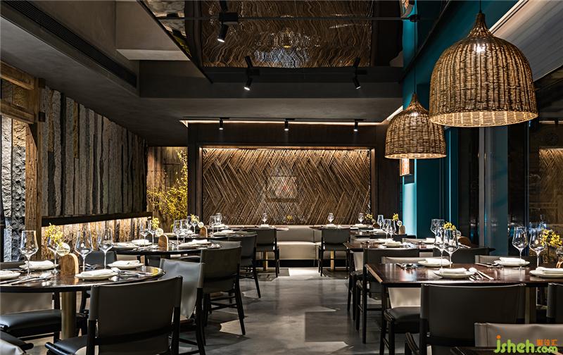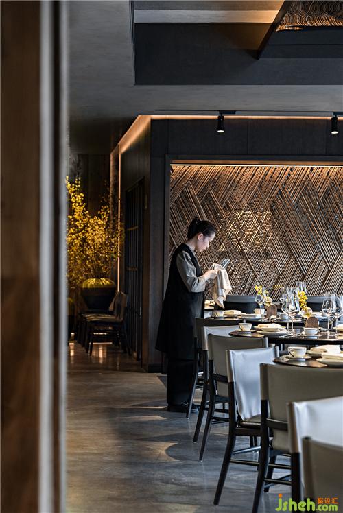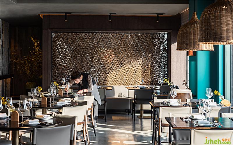 開放就餐區(qū)里,竹子、藤條經(jīng)過有節(jié)奏感的編織獲得了新身份,作為屏風(fēng)、屋面裝置、吧臺(tái)等等,設(shè)計(jì)師賦予它們簡(jiǎn)潔當(dāng)代的整體感,又利用質(zhì)樸材料本身創(chuàng)造細(xì)節(jié)中豐富的精致。