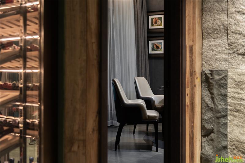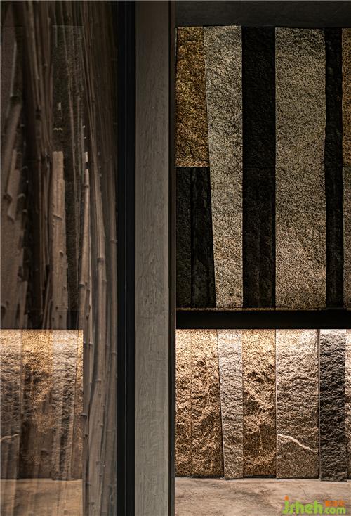 不同色彩的青石板同樣完全保留原始狀態(tài),但通過切割和重新組合得到縱向拼接的整個(gè)墻面,它們向上延伸拉長(zhǎng)視線,山石自然風(fēng)貌呼之欲出。
