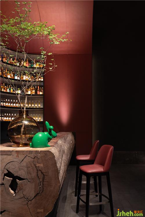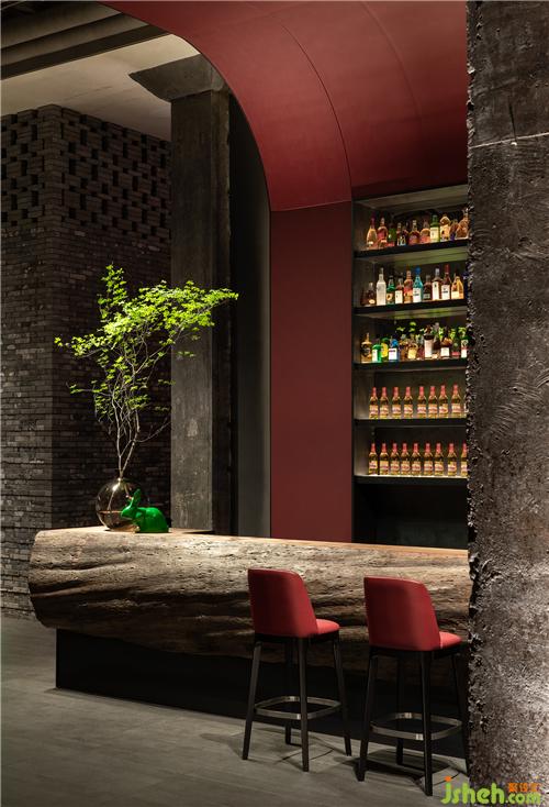 紅色吧臺(tái)區(qū)構(gòu)建出另外一個(gè)場(chǎng)景——5.2米高的紅色立面向上延伸、彎曲成弧形頂面與建筑結(jié)構(gòu)相接形成灰色水泥盒子中一個(gè)嵌套的模塊,古老京城似乎正從這一隅慢慢醒來(lái),被注入鮮活涌動(dòng)的生命力。