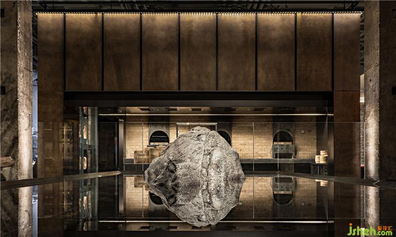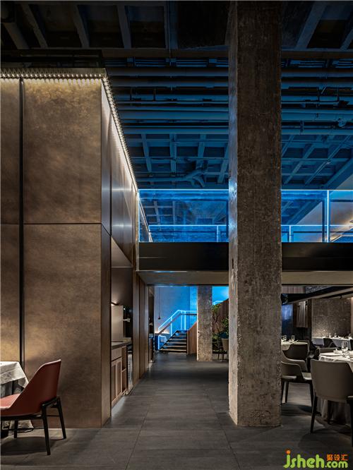 進(jìn)入晚餐時(shí)段,大面積渲染的藍(lán)色燈光從天花及部分墻面“溢出”,如同數(shù)字化的夜晚天光。當(dāng)代設(shè)計(jì)手法、傳統(tǒng)地域文化與舊建筑符號(hào)交匯成動(dòng)態(tài)的時(shí)間線,和進(jìn)入空間的每個(gè)人發(fā)生交互。