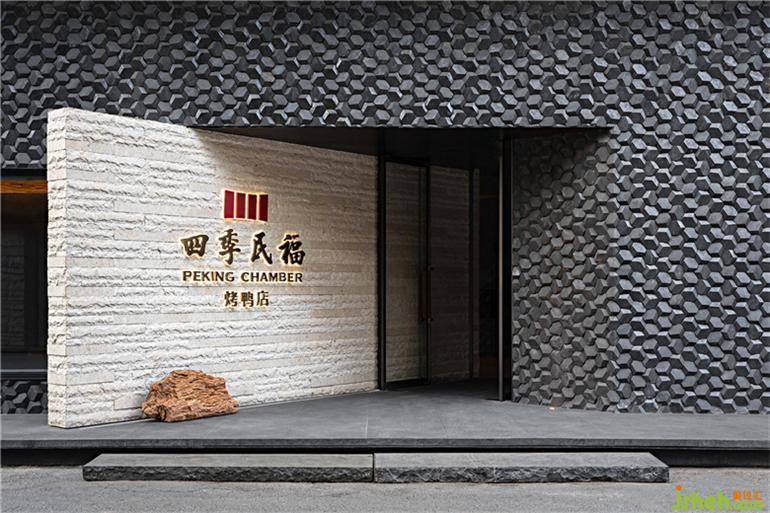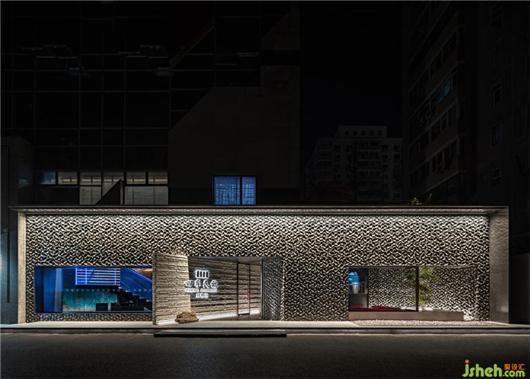 抵達新店入口,需要沿向軍南里并不寬闊的小路向西稍作步行,原有的店門雖然很大,但少了柳暗花明的志趣,正向南開也使它并不引人注目。于是,設(shè)計師將門頭改為窄門,并向南旋轉(zhuǎn)一定角度,于是所有進入巷子的車流和人群都能被門頭吸引,深色石材的大膽使用讓規(guī)則的建筑結(jié)構(gòu)更富有力量,從略顯狹小的門口進入,是暫時離開城市的探險。