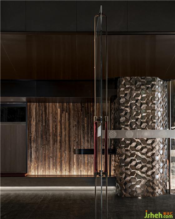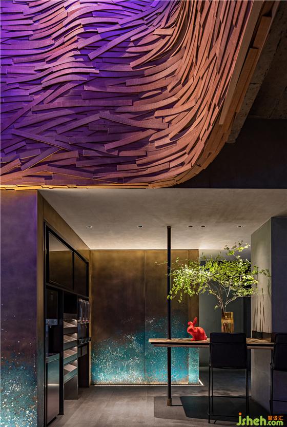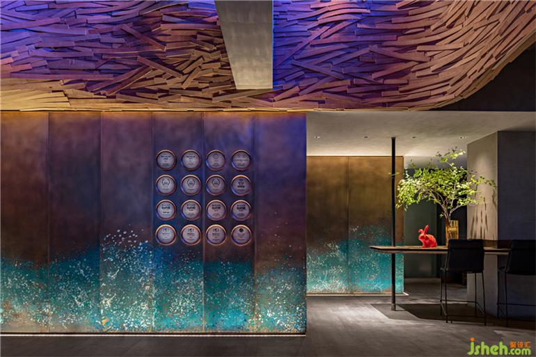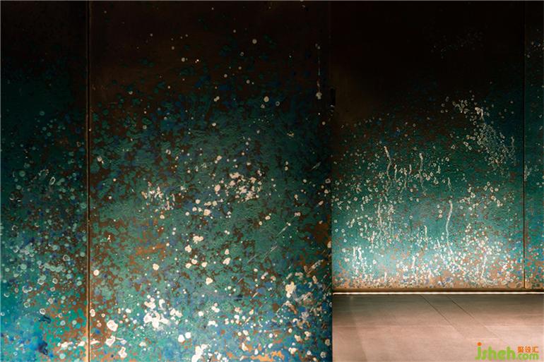 經(jīng)過多次腐蝕結(jié)合“潑彩”實驗,設(shè)計師團隊在現(xiàn)場制作出了千變?nèi)f化的“潑彩”效果銅板,作為立面材料大量應(yīng)用在空間中,松石色紋樣無窮變化,如同涌動的湖底,亦或是大寫意的層巒疊嶂。