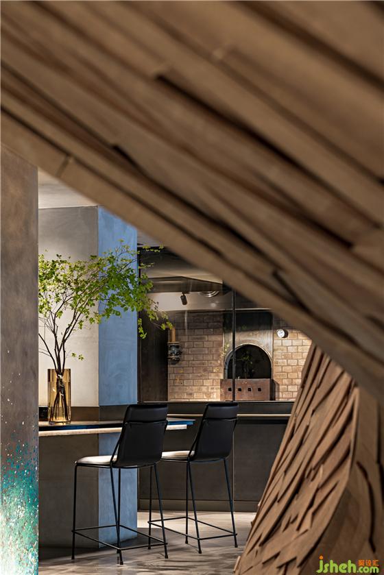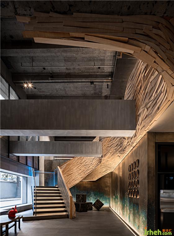 一層等候區(qū)迎來巨大的“手工雕塑”——這座表面完全在施工現(xiàn)場由木條隨意拼接而成的樓梯將視線引領(lǐng)向二層空間。北京餐廳設(shè)計無數(shù)材料單體共同形成了迂回向上的路徑,“逆流而上”的粗礦力量裹挾十足的動感,向所有步入其中的人宣告空間的獨立與唯一性。