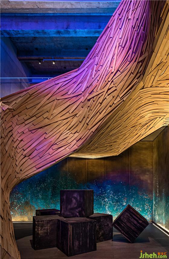 在藍(lán)紫色的燈光渲染下,沿扶梯向上如同穿梭一條聲色迷離的幻境通道,粗糲原始的自然釋放出勃勃生機(jī)。