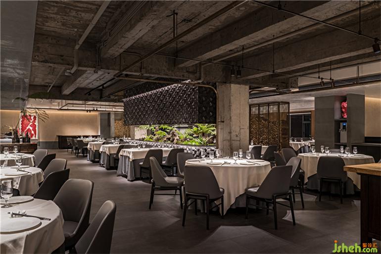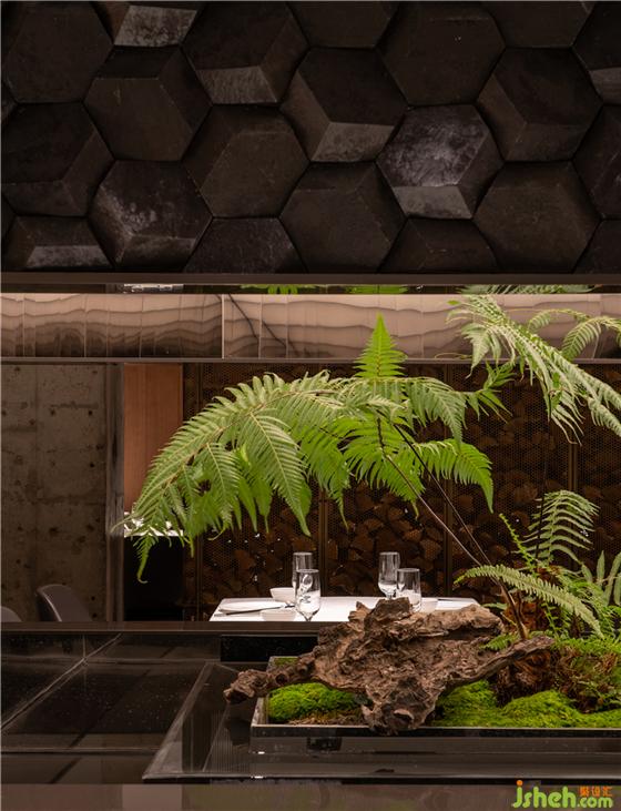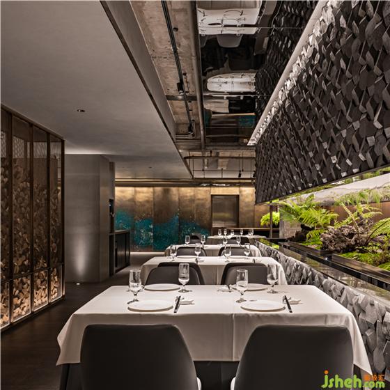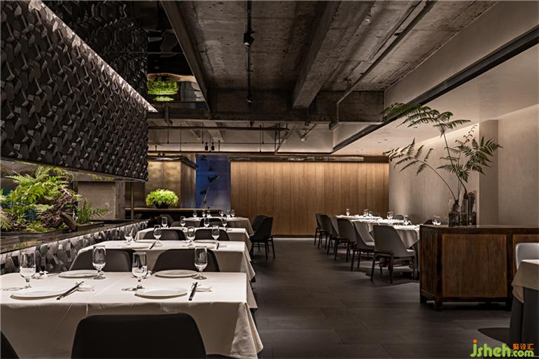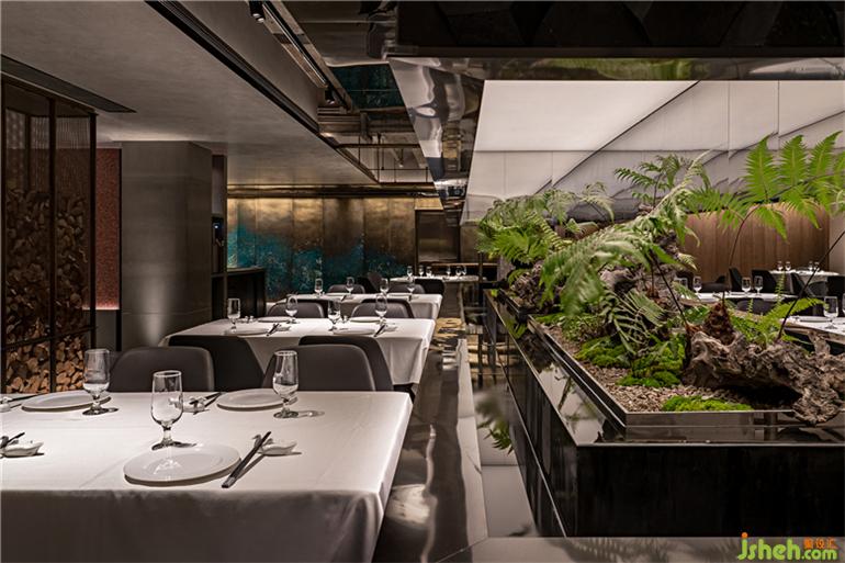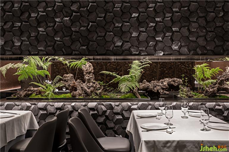 于是,設(shè)計(jì)師在整個(gè)空間中央置入了狹長(zhǎng)的景觀,上下由和門頭一致的青石包裹,呈現(xiàn)出深淺自然變化的水墨效果。北京餐廳設(shè)計(jì)留出中間狹長(zhǎng)蔥郁的一條“風(fēng)景帶”,蔥蔥綠意和深灰色石材形成強(qiáng)烈的視覺反差,更加烘托出山水輕松、盎然舒朗。