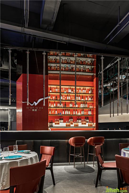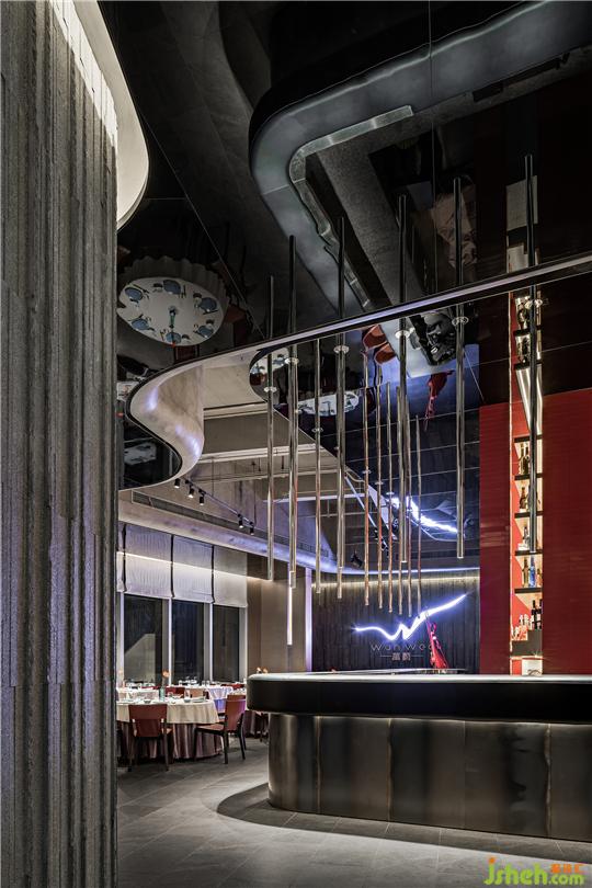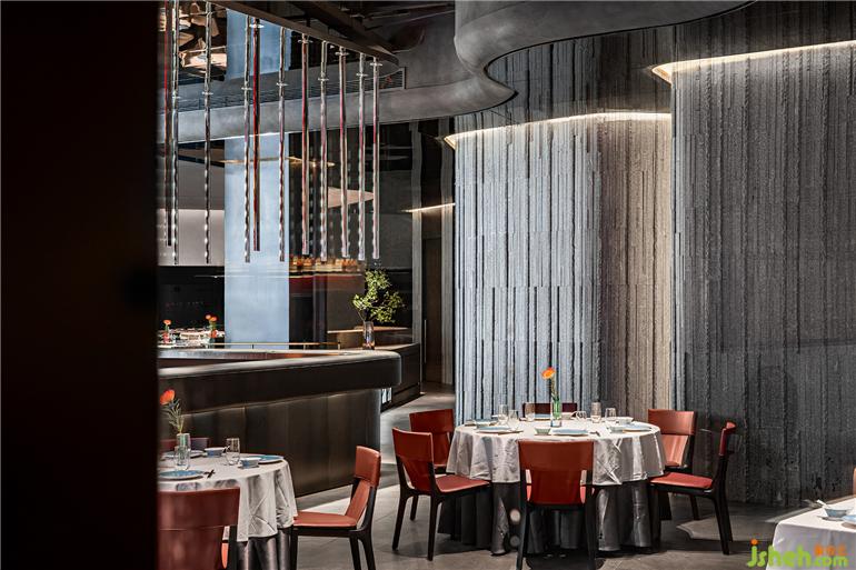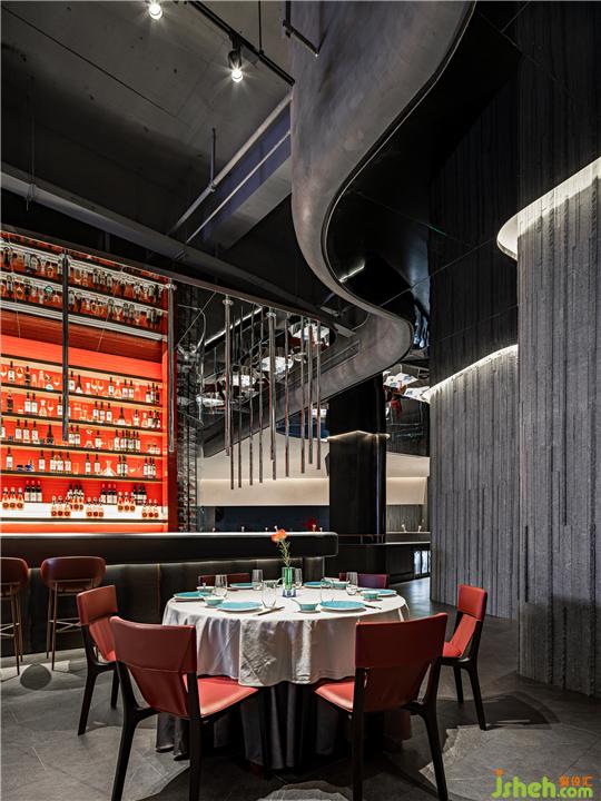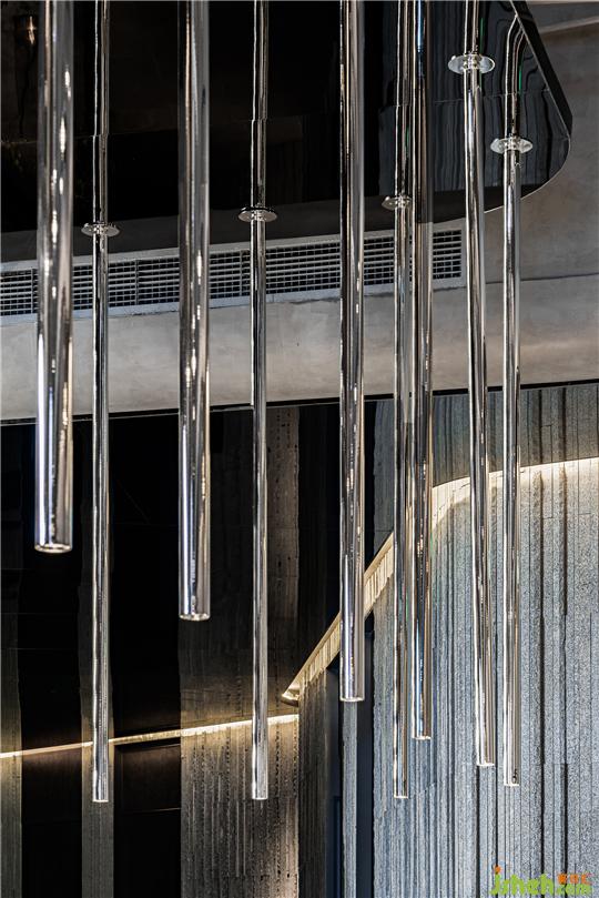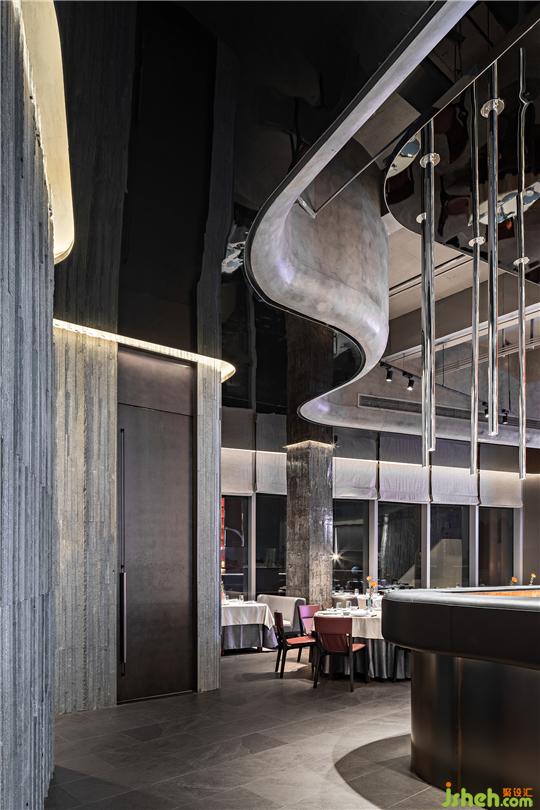 深沉底色上,天花流線(xiàn)與弧面是攪動(dòng)空間活力的低調(diào)開(kāi)端,空間流動(dòng)感抵消了本可能出現(xiàn)的清冷情緒。餐廳設(shè)計(jì)吧臺(tái)頂部深色鏡面不銹鋼板倒映光怪陸離的摩登區(qū)域,細(xì)長(zhǎng)金屬管筒燈筆直排開(kāi)垂吊,精致的工業(yè)感毫無(wú)矯揉造作,像極年輕人的宣告。