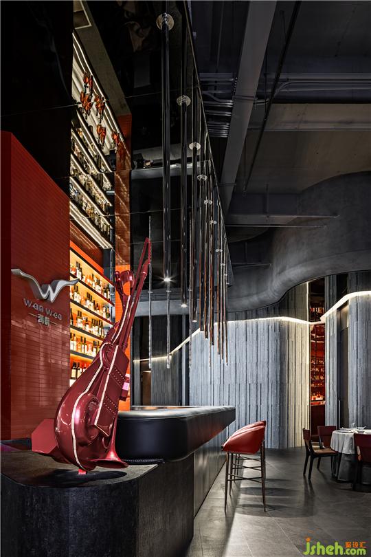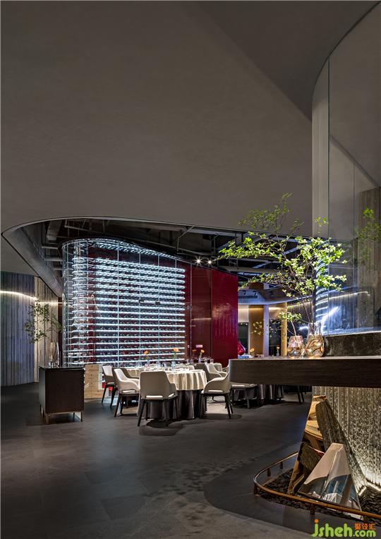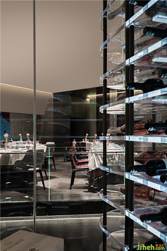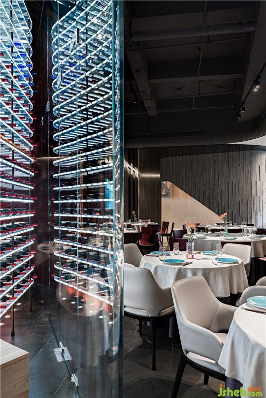 散座區(qū)中央,從天花向下插到地面的酒窖“雕塑”是整個空間的視覺中心。餐廳設計在冷靜色調中,半透明的亞克力酒架與正紅色墻體一圓一方,在層疊陣列的燈管管線烘托下點亮,也點燃了整個餐廳。